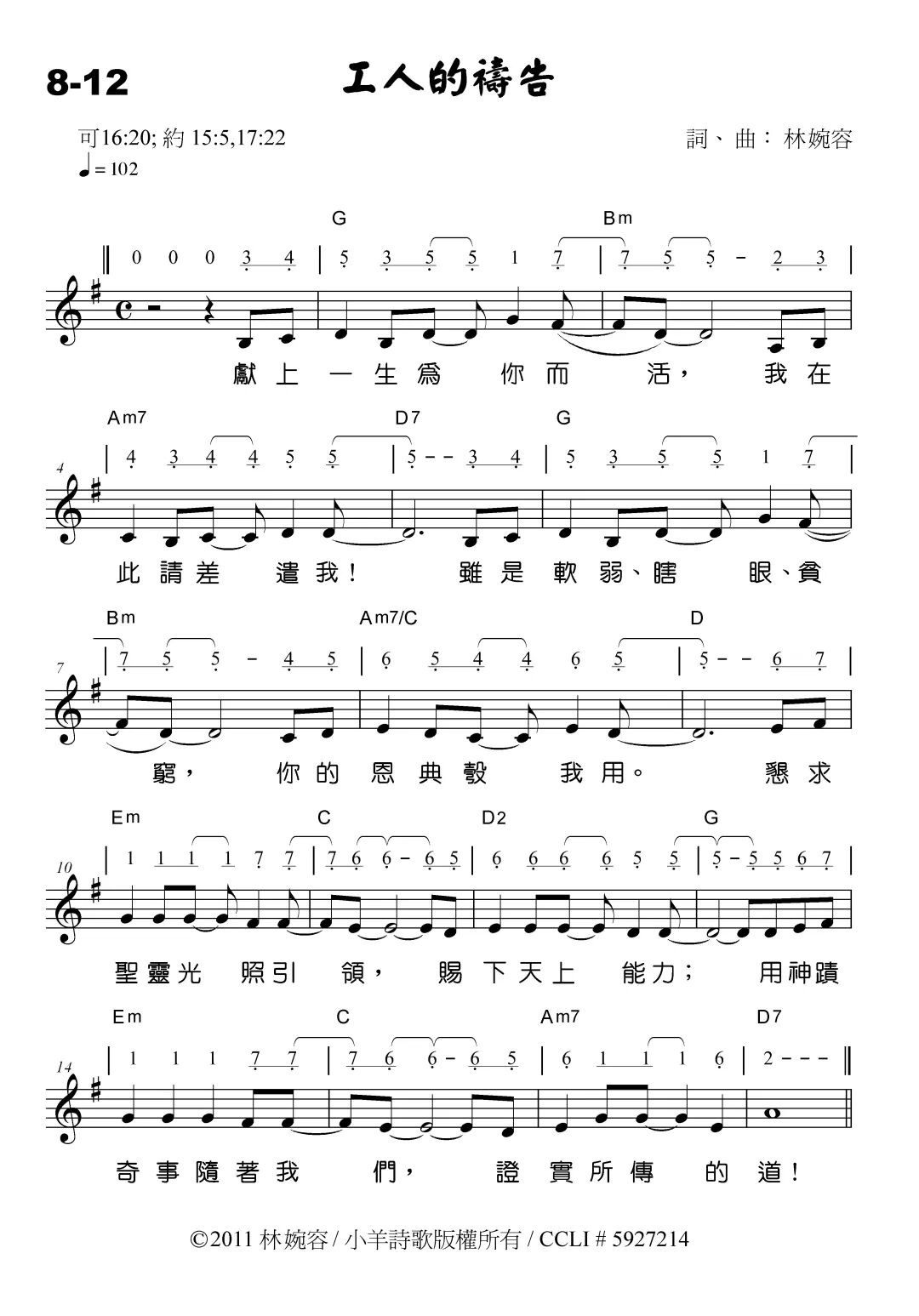 +- 首页 教会动态 正文 工人的祷告 所属歌手:小羊诗歌 献上一生为祢而活我在此 请差遣我虽是软弱 瞎眼 贫穷祢的恩典够我用恳求圣灵光照引领赐下天上能力用神迹奇事随着我们证实所传的道离了祢 我们不能做什么祢是葡萄树 我们是枝子使我们常在祢里面 让活水涌流使我们在祢的里面合一如同祢与父原为一在这地同心合意 奉主名兴旺福音 -歌谱- ✞ 教会思考教会动态话题实事神学探讨事工机构教会牧者关怀教会事工 主内资讯 收藏 分享 链接