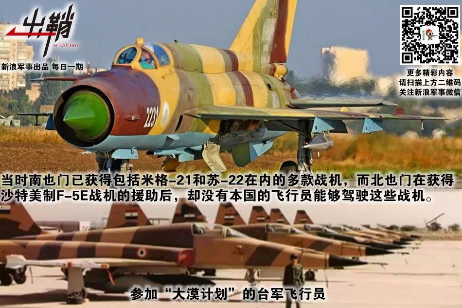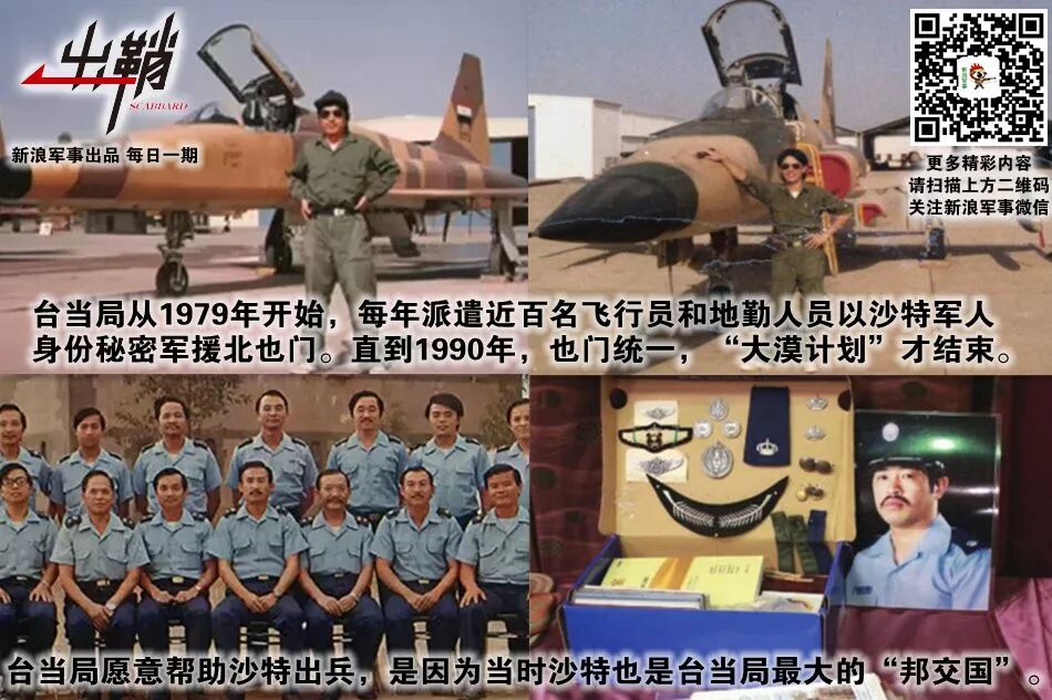 1979年,台军“大漠中队”人员穿着沙特空军军服,乘坐C-119运输机从台南飞至沙特塔依夫基地,随后8名飞行员首先驾驶涂有沙特军徽的F-5B战机前往北也门基地。当时前往北也门的台军飞行员,多为拥有上千小时飞行经验的资深飞行员,台当局派遣他们前去与年轻的南也门空军交手,主要还是为了积累与米格-21的作战经验,以为可能的台海空战作准备,此外当时也传言解放军有部分飞行员曾前往南也门助战。值得一提的,那位曾自称帅过宋仲基的冯世宽就在这期间担任台当局驻沙特武官,参与了“大漠计划”。