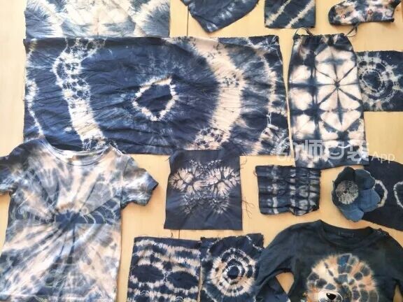 3.将捆扎好的布浸染到染料里,待上色后,解开皮筋,晒干就完成啦!