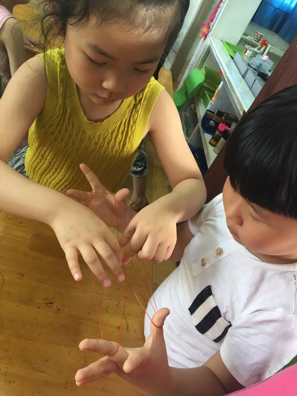 ※ 教师可以先演示一两种花样给幼儿看,接着让他们自由探索,也可以让幼儿看步骤图进行翻绳。