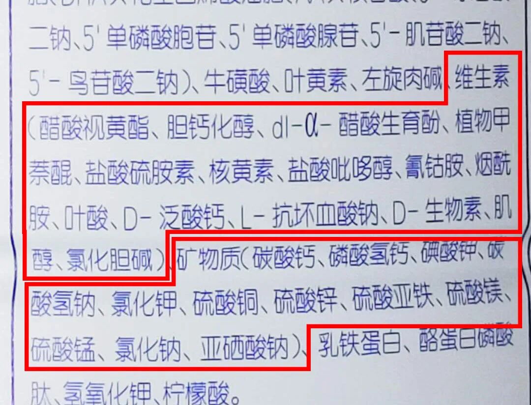 ▲配方表里的维生素、矿物质包含了很多营养成分