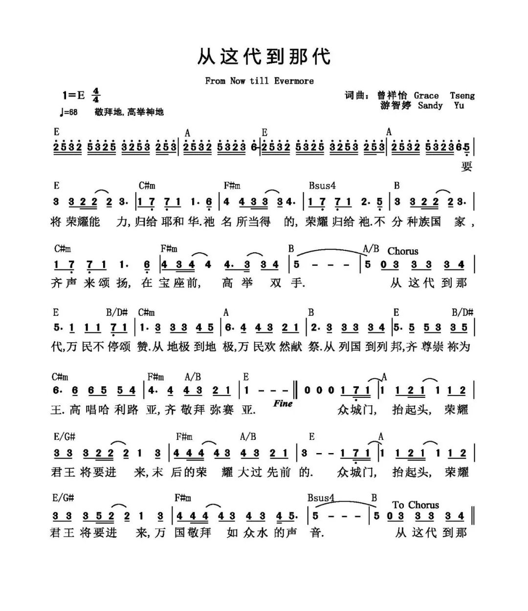 从这代到那代 From Now till Evermore 词,曲:曾祥怡、游智婷 Grace Tseng, Sandy Yu © 2014 Stream of Praise Music/BMI. CCLI: 7025177 赞美之泉版权所有 [Verse 1] 要将荣耀能力 归给耶和华 他名所当得的 荣耀归给他 不分种族国家 齐声来颂扬 在宝座前高举双手 [Chorus] 从这代到那代 万民不停颂赞 从地极到地极 万民欢然献祭 从列国到列邦 齐尊崇你为王 高唱哈利路亚 齐敬拜弥赛亚 [Bridge] 众城门 抬起头 荣耀君王将要进来 末后的荣耀大过先前的 众城门 抬起头 荣耀君王将要进来 万国敬拜如众水的声音