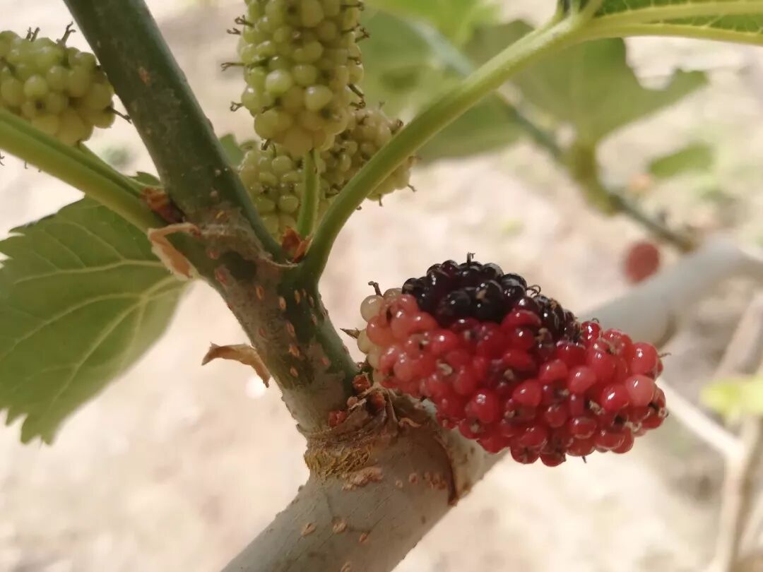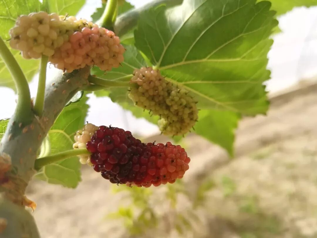 “这是南方果桑,从目前来看,是引进热带水果中长势很不错的一个。你看,去年四月引进的时候植株只有50公分,现在长好几米高了。”王文华带商报君来到一棵高大的植株前介绍。商报君看到植株已经挂果了,而且很繁茂。