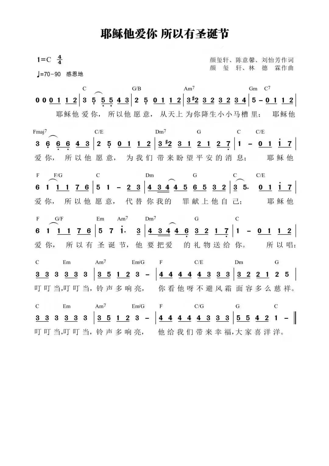 +- 首页 跨越 KUA MUSIC 正文 音频播放地址: 视频播放地址: 曲:颜玺轩/林德霖 词:颜玺轩/陈意馨/刘怡芳 编曲:张子坚/谢杰 制作人:谢杰 耶稣他爱你 所以他愿意 从天上为你降生小小马槽里 耶稣他爱你 所以他愿意 为我们带来盼望平安的消息 耶稣他爱你 所以他愿意 代替你我的罪献上他自己 耶稣他爱你 所以有圣诞节 他要把爱的礼物送给你 所以唱 叮叮当 叮叮当 铃声多响亮 你看他呀 不避风霜 面容多么慈祥 叮叮当 叮叮当 铃声多响亮 他给我们带来幸福 大家喜洋洋 歌谱: HTBB敬拜跨越 KUA MUSIC约书亚敬拜火把音乐天堂敬拜GoodTv环球敬拜 收藏 分享 链接