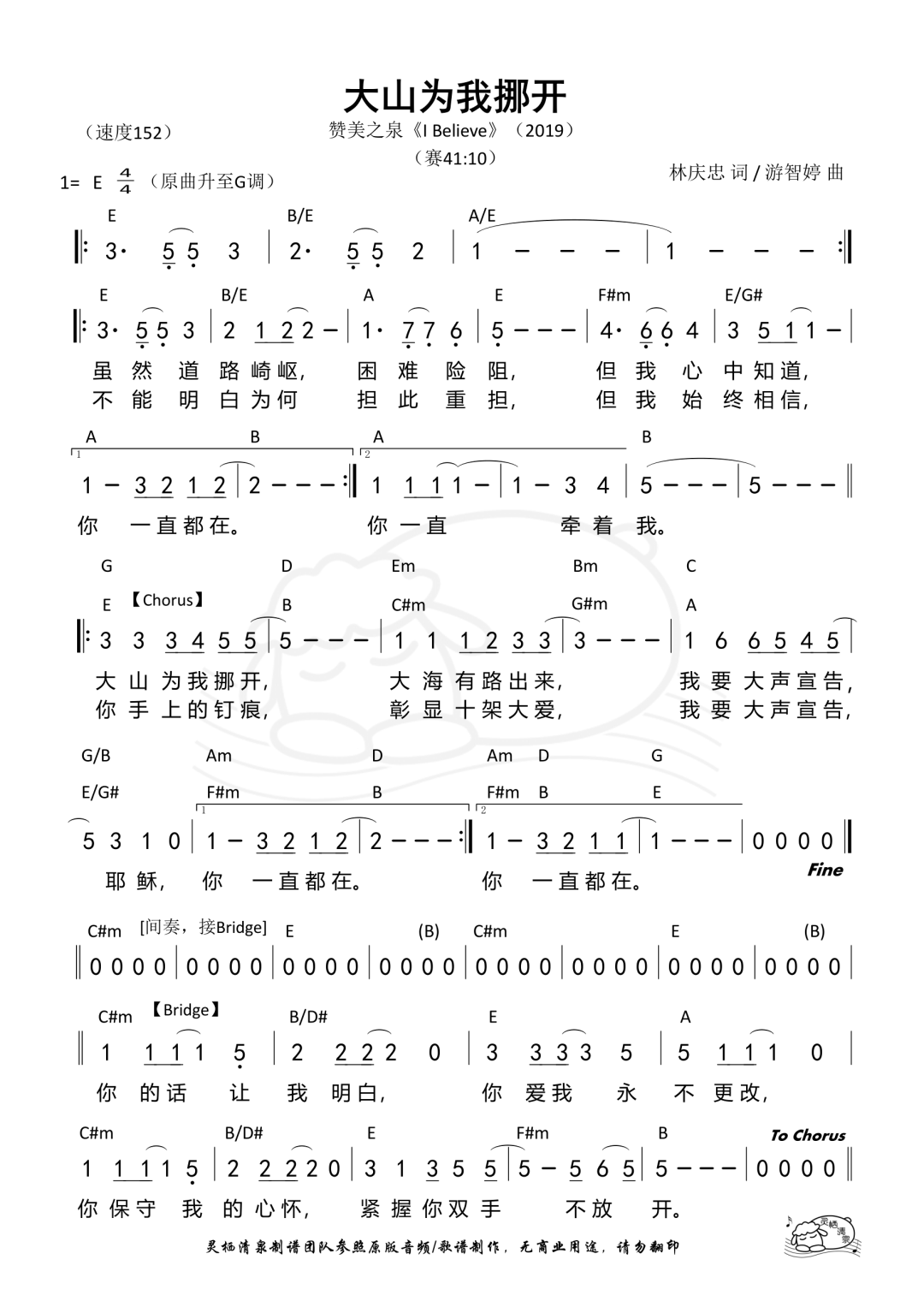 大山为我挪开 ©赞美之泉音乐事工 男:虽然道路崎岖困难险阻 但我心中知道祢一直都在 不能明白为何担此重担 但我始终相信祢一直牵着我 合:大山为我挪开大海有路出来 我要大声宣告耶稣祢一直都在 祢手上的钉痕彰显十架大爱 我要大声宣告耶稣祢一直都在 男:祢一直都在yeah 合:虽然道路崎岖困难险阻 但我心中知道祢一直都在 不能明白为何担此重担 但我始终相信祢一直牵着我 女:大山为我挪开大海有路出来 合:我要大声宣告耶稣祢一直都在 祢手上的钉痕彰显十架大爱 我要大声宣告耶稣祢一直都在 女:祢的话让我明白 祢爱我永不更改 祢保守我的心怀 紧握祢双手不放开 男:祢的话让我明白 合:祢爱我永不更改 祢保守我的心怀 紧握祢双手不放开 大山为我挪开大海有路出来 我要大声宣告耶稣祢一直都在 祢手上的钉痕彰显十架大爱 我要大声宣告耶稣祢一直都在 我要大声宣告耶稣祢一直都在