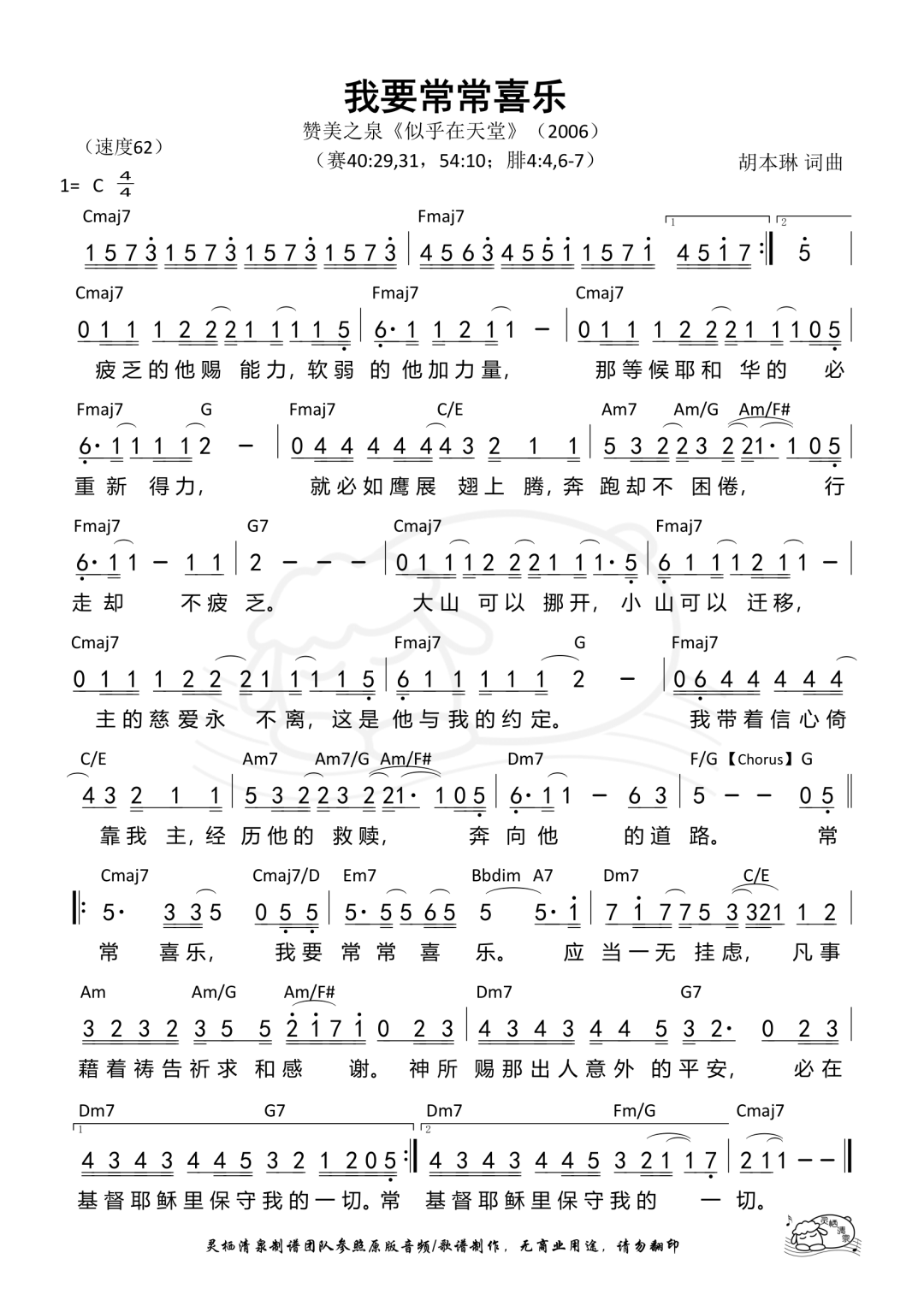 我要常常喜乐 I Will Always Rejoice 词/曲:胡本琳 Mimi Hu © 2006 Stream of Praise Music/BMI. CCLI: 4716103 赞美之泉版权所有 [Verse] 疲乏的他赐能力 软弱的他加力量 那等候耶和华的必重新得力 就必如鹰展 翅上腾 奔跑却不 困倦 行走却不疲乏 大山可以挪开 小山可以迁移 主的慈爱永不离 这是他与我的约定 我带著信心倚 靠我主 经历他的 救赎 奔向他的道路 [Chorus] 常常喜乐 我要常常喜乐 应当一无挂虑 凡事藉著祷告 祈求 和感谢 神所赐那出人意外的平安 必在基督耶稣裡保守我的一切 常常喜乐 我要常常喜乐 应当一无挂虑 凡事藉著祷告 祈求 和感谢 神所赐那出人意外的平安 必在基督耶稣裡保守我的一切