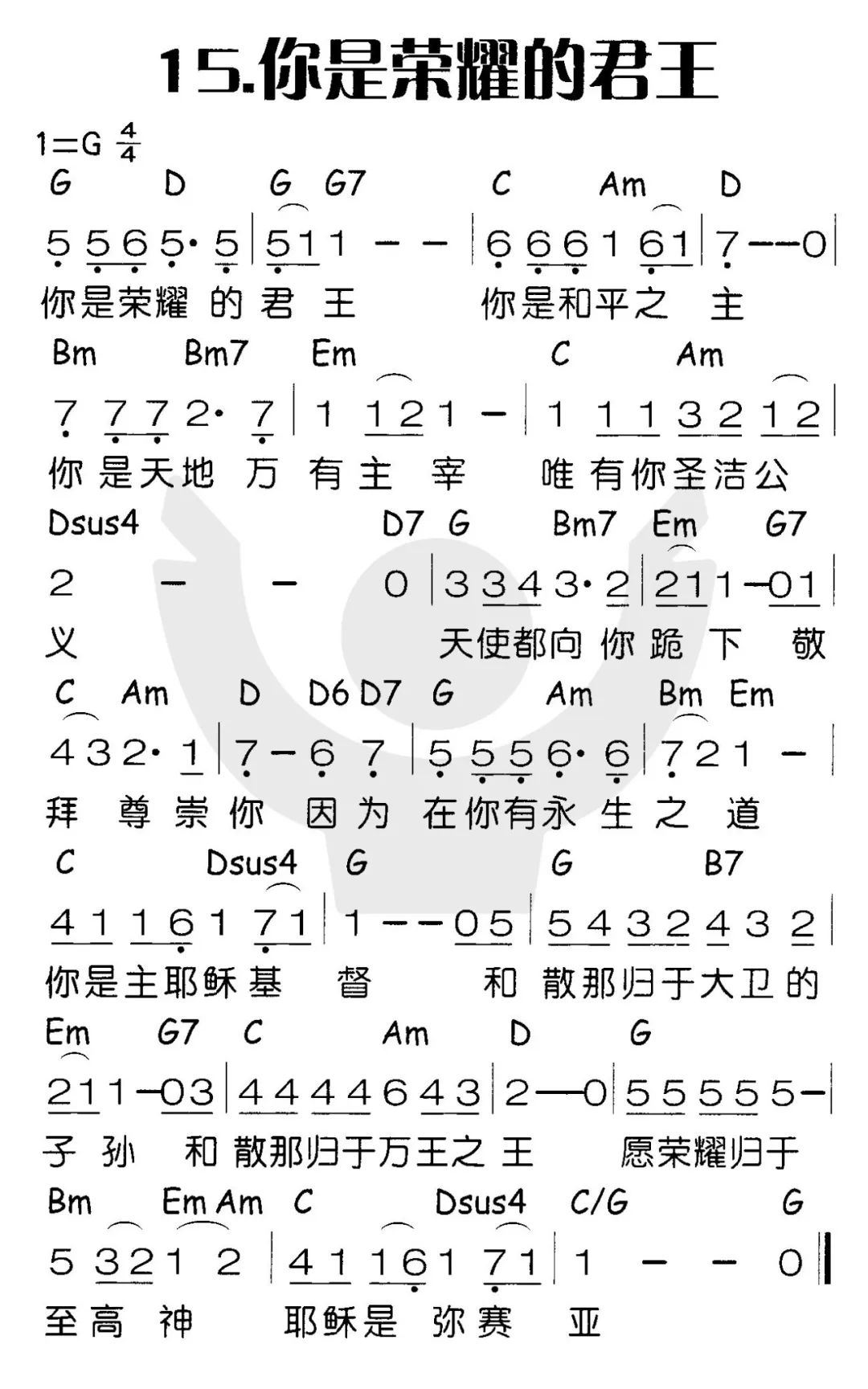 +- 首页 赞美诗歌 正文 音频播放地址: 视频播放地址: 祢是荣耀的君王 祢是和平之主 祢是天地万有主宰 唯有祢圣洁公义 天使都向祢跪下 敬拜尊崇祢 因为在祢有永生之道 祢是主耶稣基督 和散那归于大卫的子孙 和散那归于万王之王 愿荣耀归于 至高神 耶稣是弥赛亚 歌谱: 赞美诗歌未整理以斯拉盛晓玫祝瑞莲生命河灵粮堂小羊诗歌Jesus Image天韵合唱团新酒使命团我心旋律JLSS BlessedThe Hope佳音 收藏 分享 链接