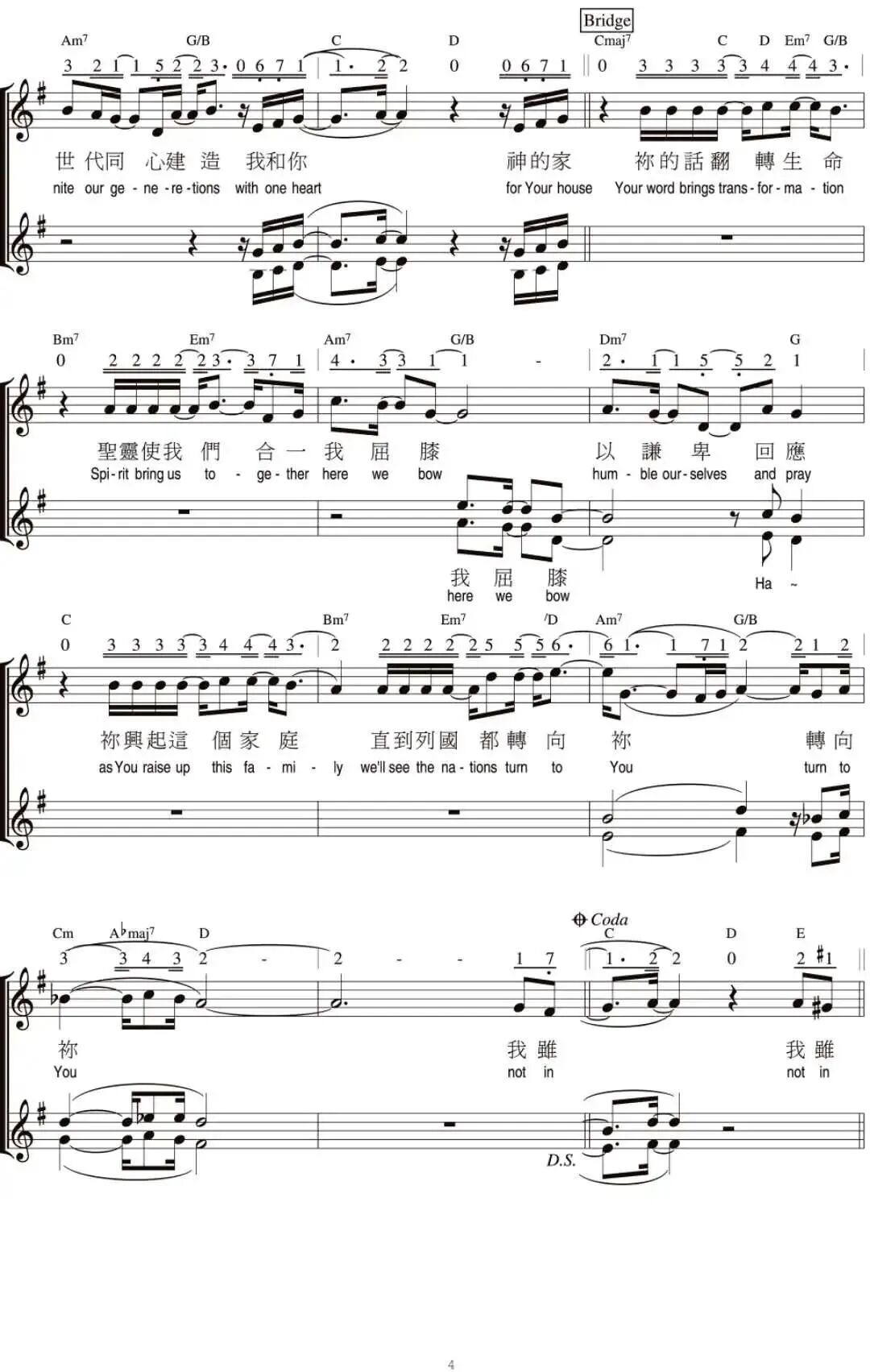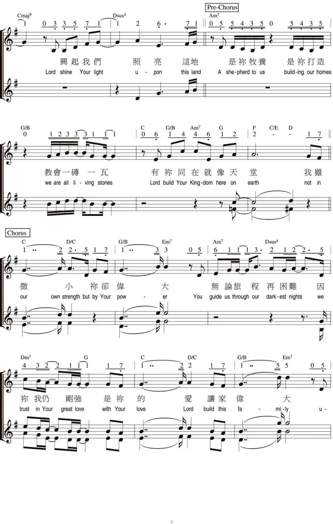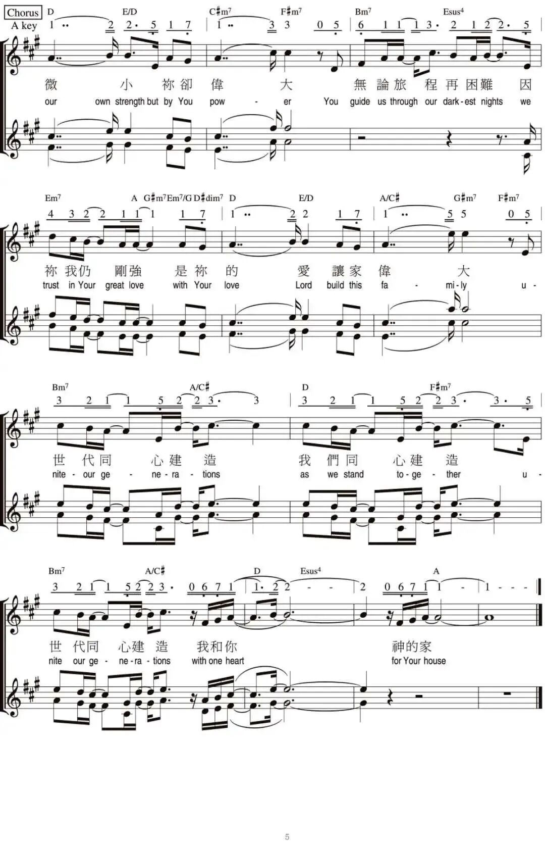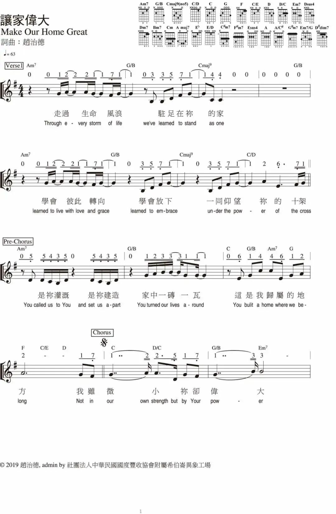 让家伟大 / Make Our Home Great 作词 Lyrics:赵治德 Samuel Chao 作曲 Composer:赵治德 Samuel Chao 演唱 Singers:陈州邦 Ben Chen、曾晨恩 Yosifu Tseng、周巽光 Ewen Chow、赵治德 Samuel Chao、玺恩 SiEnVanessa、李晓茹 Jamie Lee、曹之懿 Isabelle Tsao English lyrics translated by Joy Sung and Jon Pettigrew 製作人 Producer:赵治德 Samuel Chao 配唱製作人 Vocal Producer:曹之懿 Isabelle Tsao 製作协助 Production assistance:刘淑莉 Lily Liu - Verse1 走过生命风浪 驻足在你的家 Through every storm of life, we’ve learned to stand as one 学会彼此转向 学会放下 Learned to live with love and grace, learned to embrace 一同仰望你的十架 Under the power of the cross Pre-Chorus1 是你灌溉 是你建造 You called us to You and set us apart 家中一砖一瓦 You turned our lives around 这是我归属的地方 You built a home where we belong Chorus1 我虽微小 你却伟大 Not in our own strength, but by Your power 有你在家就没有人 还需要惧怕 In Your presence, there is no fear, we know that You are here (I know this is home) 是你的爱 让家伟大 In Your love Lord, build this family 你荣耀发出光芒 唯有你 是盼望 Our hope will stand forever, as You shine, on our home Verse2 天父的心涌出 一条生命河流 There’s a river full of life, flowing from Your heart 医治破碎心灵 使我苏醒 And every broken heart, You heal and restore 兴起我们照亮这地 Lord shine Your light upon this land Pre-Chorus 2 是你牧养 是你打造 教会一砖一瓦 A shepherd to us, building our homes, we are all living stones 有你同在就像天堂 Lord build Your kingdom here on earth Chorus2 我虽微小 你却伟大 Not in our own strength, but by Your power 无论旅程再困难 因你我仍刚强 You guide us through our darkest nights, we trust in Your great love 是你的爱 让家伟大 With Your love Lord, build this family 世代同心建造 Unite our generations 我和你 神的家 With one heart, for Your house Bridge 你的话翻转生命 Your Word brings transformation 圣灵使我们合一 Spirit bring us together 我屈膝 以谦卑回应 Here we bow, humble ourselves and pray 你兴起这个家庭 As You raise up this family 直到列国都转向你 转向你 We’ll see the nations turn to You - turn to You Tag 世代同心建造 Unite our generations 我们同心建造 As we stand together 世代同心建造 Unite our generations 我和你 神的家 With one heart, for Your house