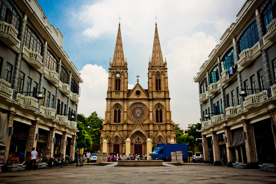 广州石室圣心大教堂石室圣心大教堂是天主教在广州教区最大的教堂,也是目前国内最大的哥特式建筑,同时还是全球四座全石结构哥特式教堂建筑之一,教堂塔尖高58.5米,全身都由花岗岩打造。教堂正面有一对巍峨高耸的双尖石塔,石塔中间有四具从法国运来的大铜钟。教堂内的彩色玻璃窗、遍布墙壁的合掌式花窗棂都见证着一对对新人的华丽登场。