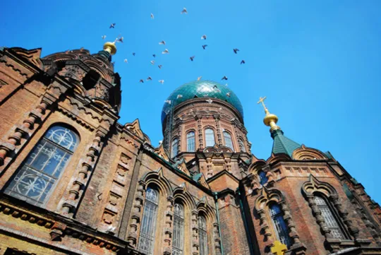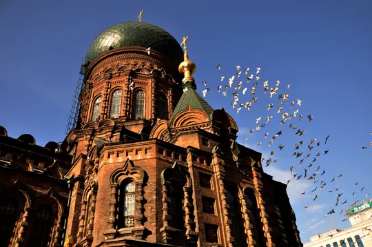 哈尔滨圣索菲亚教堂始建于1907年的圣索菲亚教堂,是中国保存最完整的拜占庭式建筑,教堂最引人注目的部分,是高达48米的洋葱头式的大穹顶,教堂前的广场有“广场鸽”,还设有大型系列音乐喷泉,当地人非常喜欢在这里拍婚纱照。每当夜幕降临时,在灯光衬托下的教堂别具异国情调。