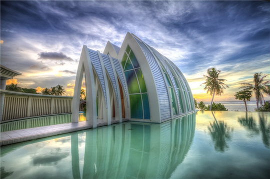 关岛彩虹教堂教堂的整体设计元素是水,教堂外部的基底和室内都是纯白色,配上彩虹色的玻璃,使得整座教堂就像浮在水面上的一条彩虹一样。Ella在这里拍的婚纱照,《恶作剧之吻II》和梁静茹MV《小手拉大手》在这里取景。教堂最多可容纳40人,新人们在最亲密的家人、朋友的陪伴下,面对无边海洋和晴朗天空,请牧师和美景作永恒之爱的见证。