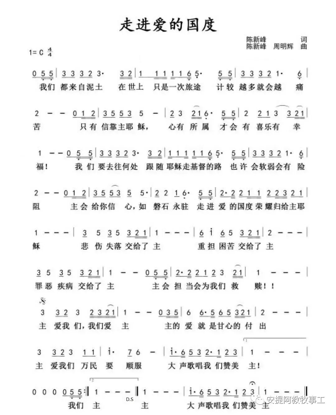+- 首页 赞美诗歌 正文 音频播放地址: 视频播放地址: Youtube播放地址: 《走进爱的国度》 作词:陈新峰 作曲:周明辉 演唱:阿莲 我们都来自泥土,在世上只是一次旅途 计较越多就会越痛苦 只要信靠主耶稣心有所属 才会有喜乐有幸福 我们要去往何处,跟随耶稣走基督的路 也许会软弱会有险阻 主会给你信心如磐石永驻 走进爱的国度,荣耀归给主耶稣 悲伤失落交给了主,重担困苦交给了主 罪恶疾病交给了主,主会担当会为我们救赎 主爱我们我们爱主,主的爱就是甘心的付出 主爱我们万民要顺服,大声歌唱我们赞美主 歌谱: 赞美诗歌未整理以斯拉盛晓玫祝瑞莲生命河灵粮堂小羊诗歌Jesus Image天韵合唱团新酒使命团我心旋律JLSS BlessedThe Hope佳音 赞美之门 收藏 分享 链接