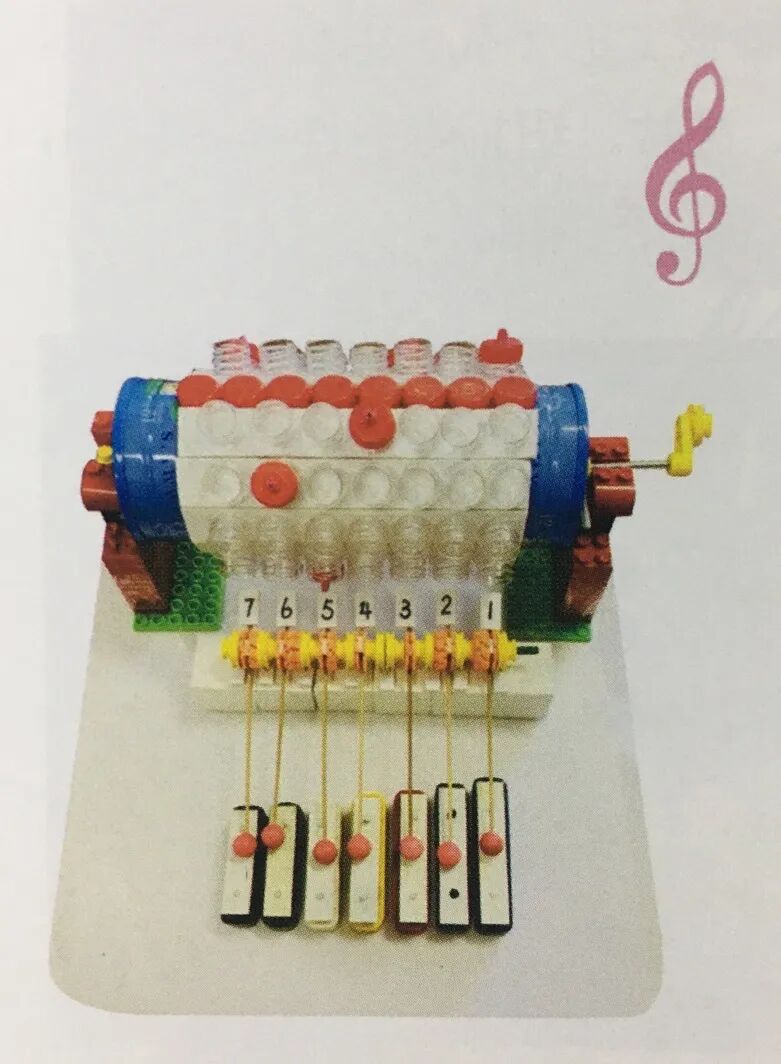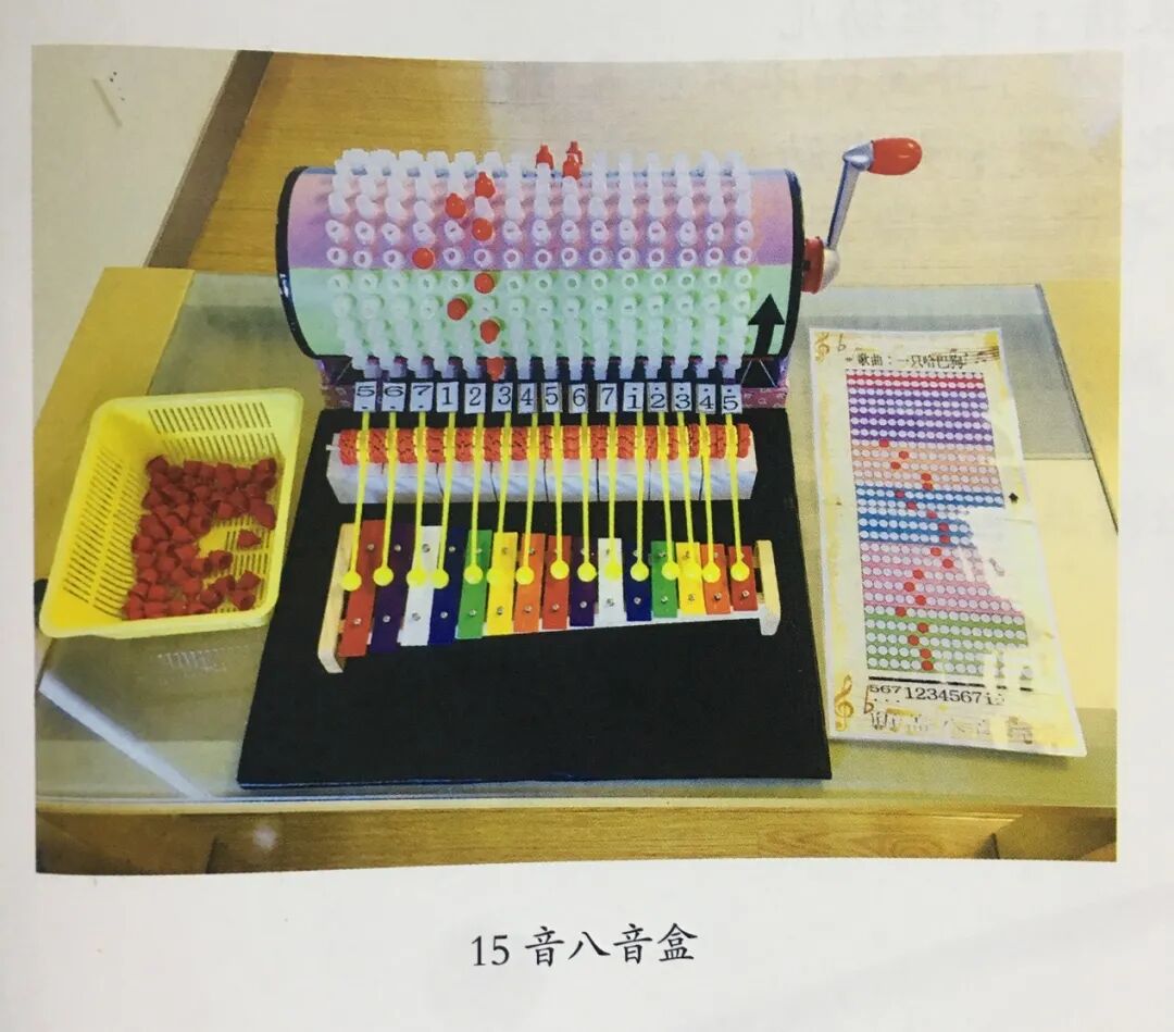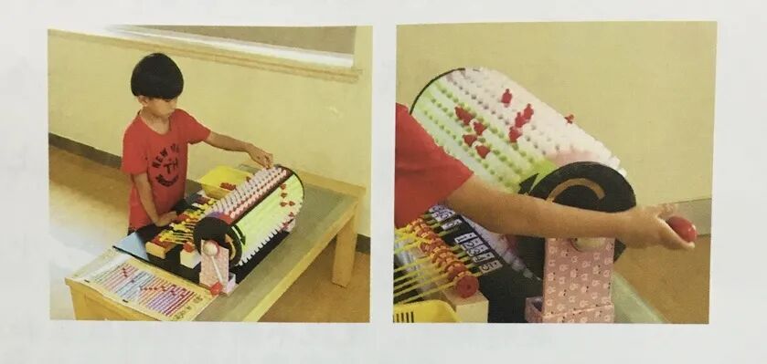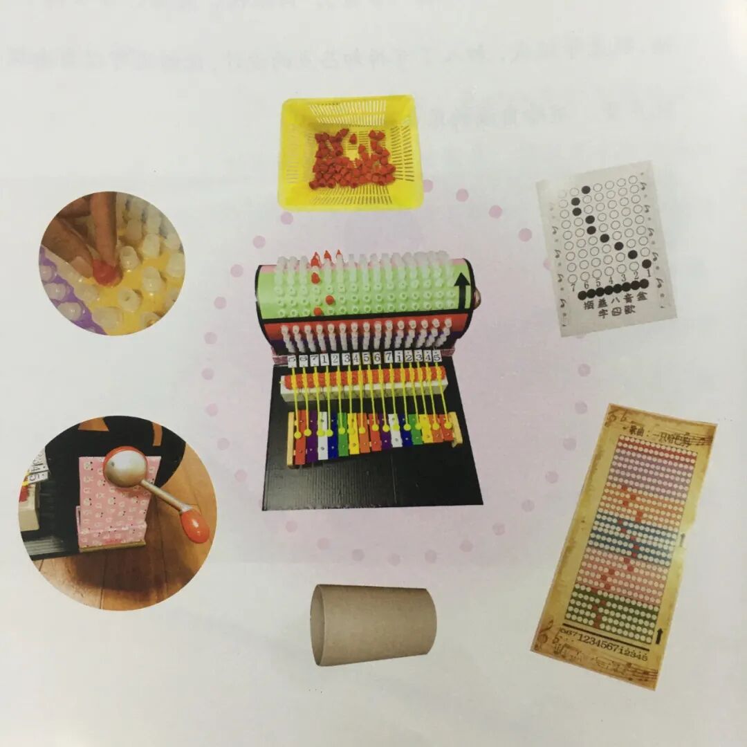 幼儿根据自制乐谱,在对应的位置拧上瓶盖,再根据乐曲节奏转动把手,使瓶盖按动铝板琴的琴锤进行敲击,就能发出美妙的音乐。