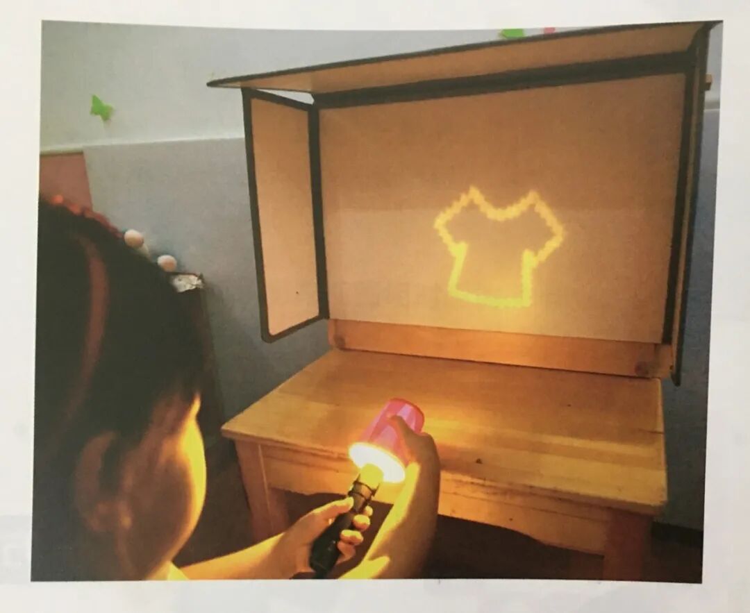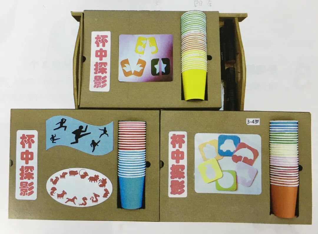《杯中探影》是利用纸杯、手电筒、图卡、收纳盒、托盘等设计而成的科学类玩教具,以玩光影游戏为主。