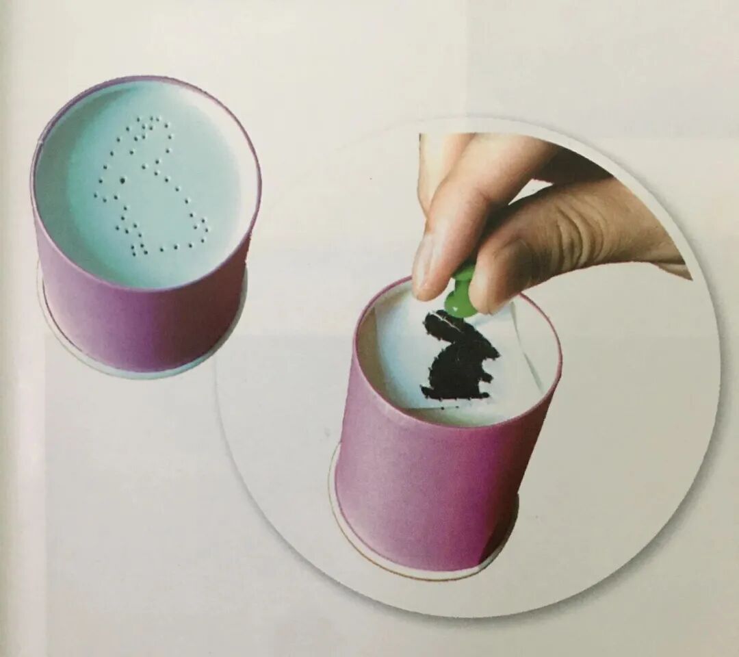 1、取纸杯,按照图卡上的图案在纸杯底部用针扎出小孔,显现不同物体的轮廓,也可只扎一半的图形。
