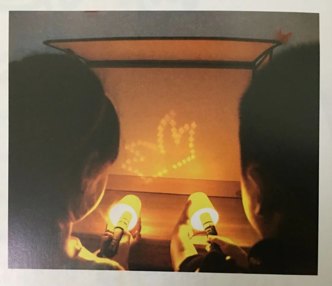 用手电筒照射杯底,看看出现了什么有趣的事物,说一说是什么。两人游戏的时候,可以玩你照我猜的游戏。