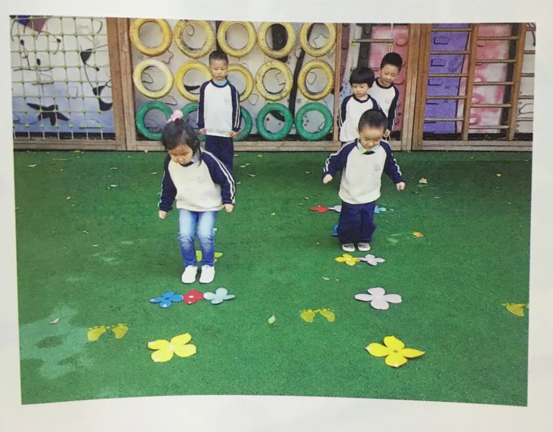将小花零星地摆放在地上,双脚并拢,连续间隔向前跳。
