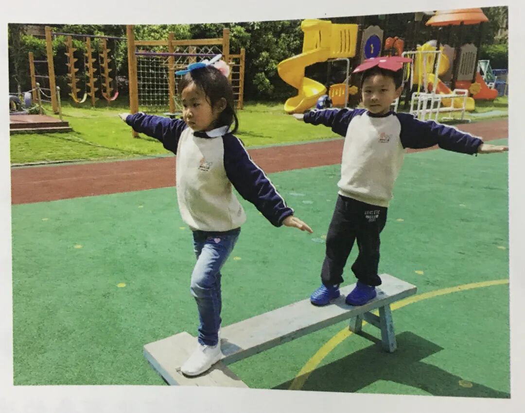 头顶小花走平衡木,抬头挺胸、双臂侧平举。在较窄的低矮物上行走一段距离。
