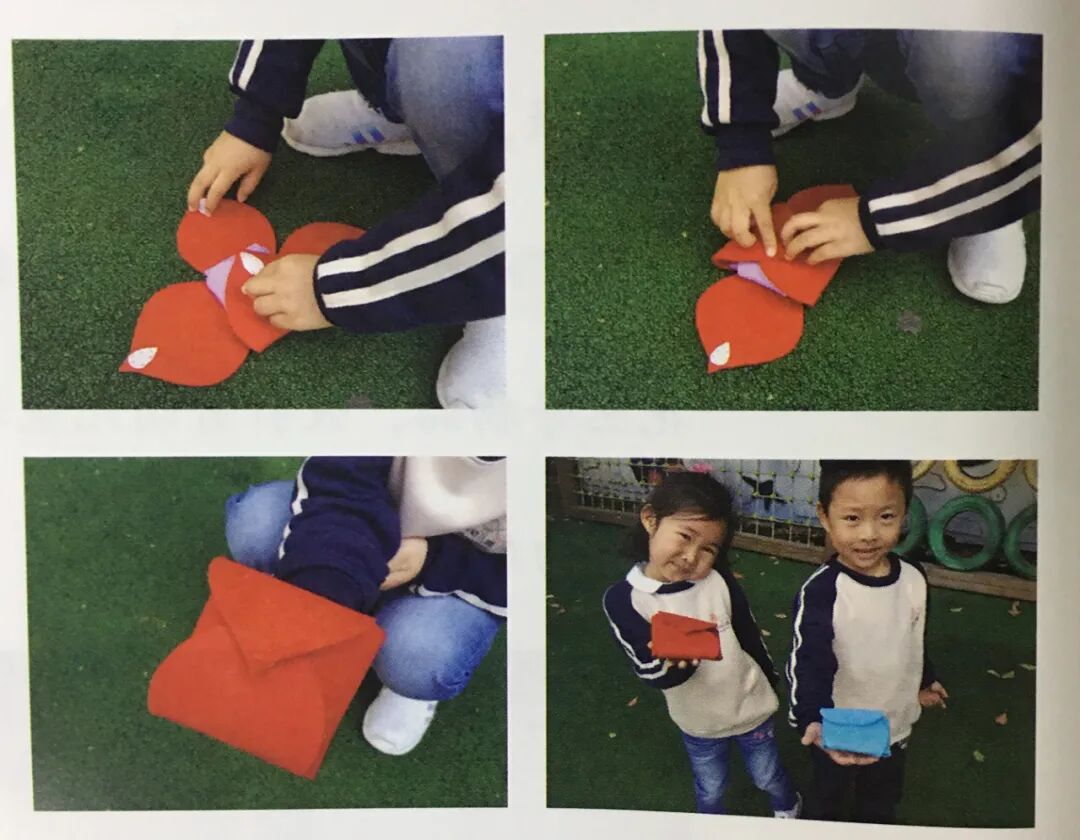将对角的花瓣贴起来,花朵就变成了小沙包。收纳花朵的篮筐就成了投掷的目标物。可以通过大小花朵的重叠增加重量,让幼儿单手投掷沙包,提高投掷能力。