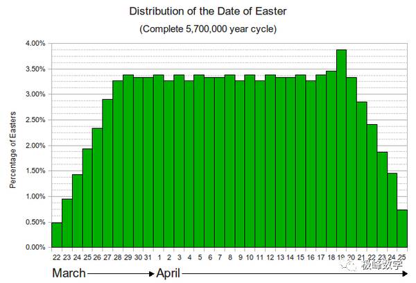 第一张来自维基百科(https://en.wikipedia.org/wiki/Computus#/media/File:Easter_Distribution.png),其中4月4、5日是复活节的概率都在3.3% ~ 3.4%之间,与我的估算相符。4月19日那个尖峰我无法解释。