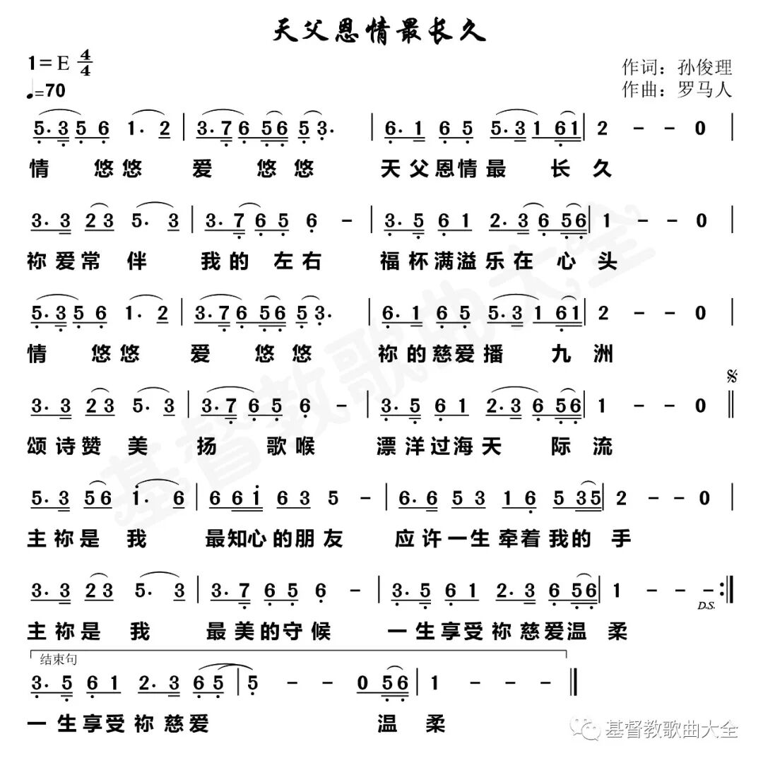 《天父恩情最长久》 作词:孙俊理 作曲:罗马人 演唱:张 莹 编曲:刘 文 混音:王志鹏 发行:细拉之声 情悠悠爱悠悠 天父恩情最长久 祢爱常伴我的左右 福杯满溢乐在心头 情悠悠爱悠悠 祢的慈爱播九州 颂诗赞美扬歌喉 漂洋过海天际流 主祢是我最知心的朋友 应许一生牵着我的手 主祢是我最美的守候 一生享受祢慈爱温柔 music…… 情悠悠爱悠悠 天父恩情最长久 祢爱常伴的我左右 福杯满溢乐在心头 情悠悠爱悠悠 祢的慈爱播九州 颂诗赞美扬歌喉 漂洋过海天际流 主祢是我最知心的朋友 应许一生牵着我的手 主祢是我最美的守候 一生享受祢慈爱温柔 主祢是我最知心的朋友 应许一生牵着我的手 主祢是我最美的守候 一生享受祢慈爱温柔 一生享受祢慈爱温柔
