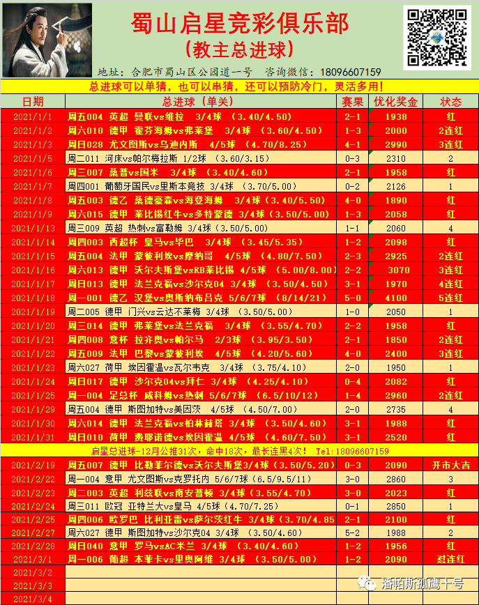 4、单关:教主总进球(1000元优化奖金2090元)