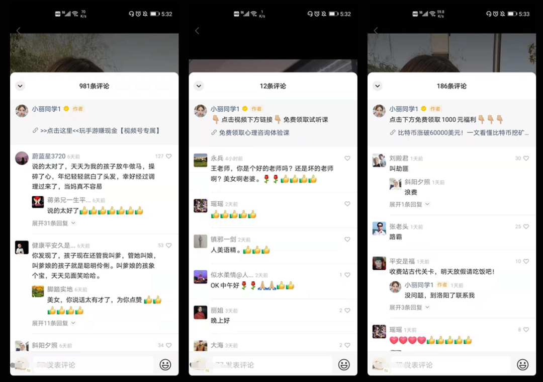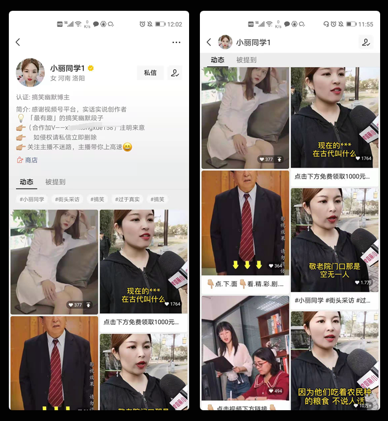 虽然说【小丽同学1】的作品直接从快手和抖音上搬运过来的,但并不妨碍她能在视频号上走红。