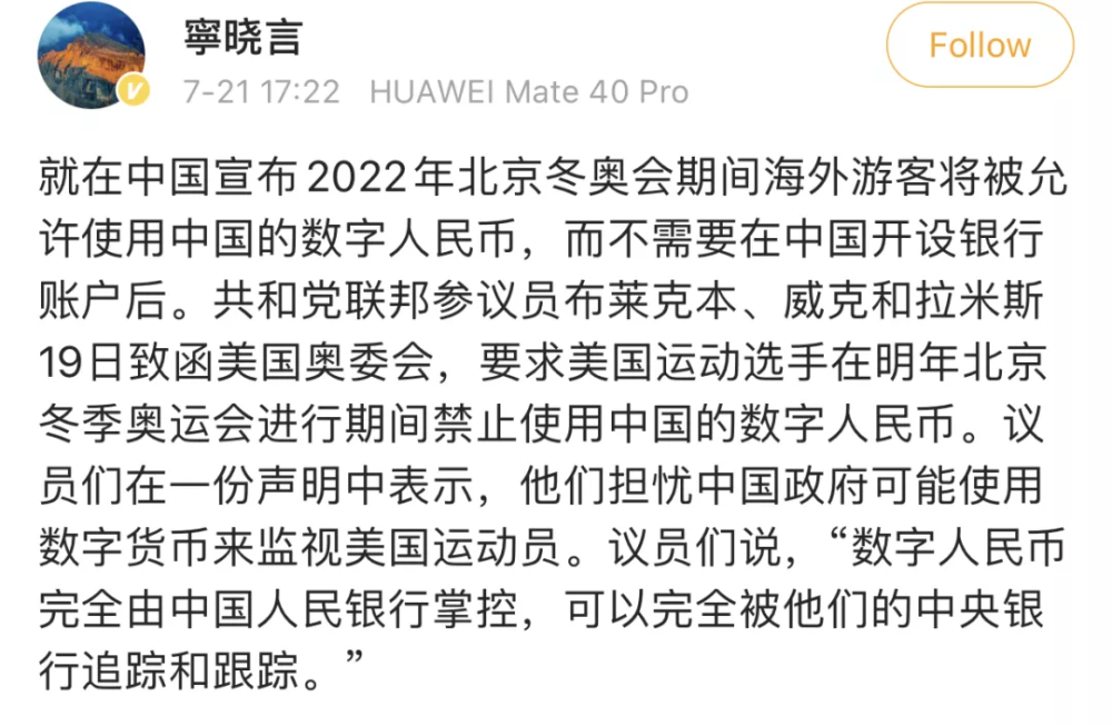 对这份白皮书,美帝方面的还是很警觉的,一些人建议,如果中国搞数字货币的话,美国应该禁止数字人民币在美国使用,因为数字人民币,会带着“心跳”,“会知道你在那里,你有多少钱,你的隐私会暴露”,还“担心”中国会利用2022年的冬奥会,向外国人推广数字人民币。
