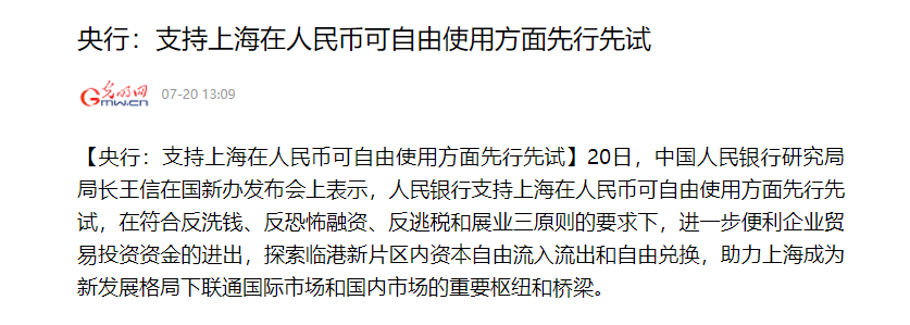 7月20日,央行突然宣布:支持上海在人民币可自由使用方面先行先试,便利企业贸易投资资金的进出,探索在临港新片区内资本自由流入流出和自由兑换,助力上海成为联通国内和国际市场的重要枢纽和桥梁。