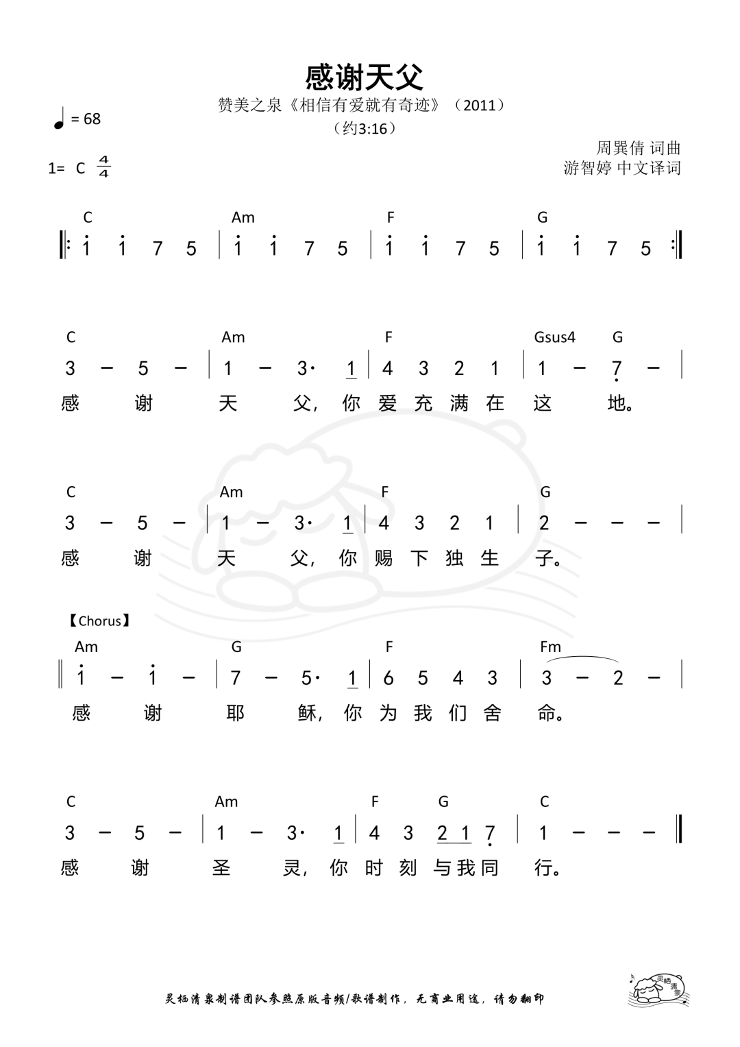 感谢天父 Thank You, Father 词/曲:周巽倩 Mary Chikagami Lee © 2011 Stream of Praise Music/BMI. CCLI: 5985555 讚美之泉版权所有 [Verse] 感谢天父 祢爱充满在这地 感谢天父 祢赐下独生子 [Chorus] 感谢耶稣 祢为我们捨命 感谢圣灵 祢时刻与我同行 ----------------------------------------------- 主祢是我盼望 Lord, You Are My Hope 词/曲:游智伟、曾祥怡 David Yu, Grace Tseng © 2011 Stream of Praise Music/BMI. CCLI: 5985562 讚美之泉版权所有 [Verse] 主祢是我盼望 我的救赎亮光 叫我抬起头来 我永远的荣耀 [Chorus] 喔!哈利路亚 献上尊荣敬拜 敬畏在祢座前 高举双手讚美 喔!哈利路亚 献上尊荣敬拜 从永远到永远 不停讚美