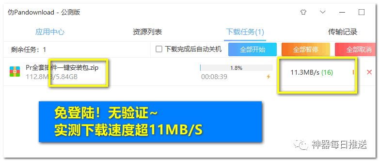 「伪PanDownload0.0.4公测版」发布了,依旧是免登陆、不限速,5.8G大文件也可以直接下载,实测下载速度超11MB/S;