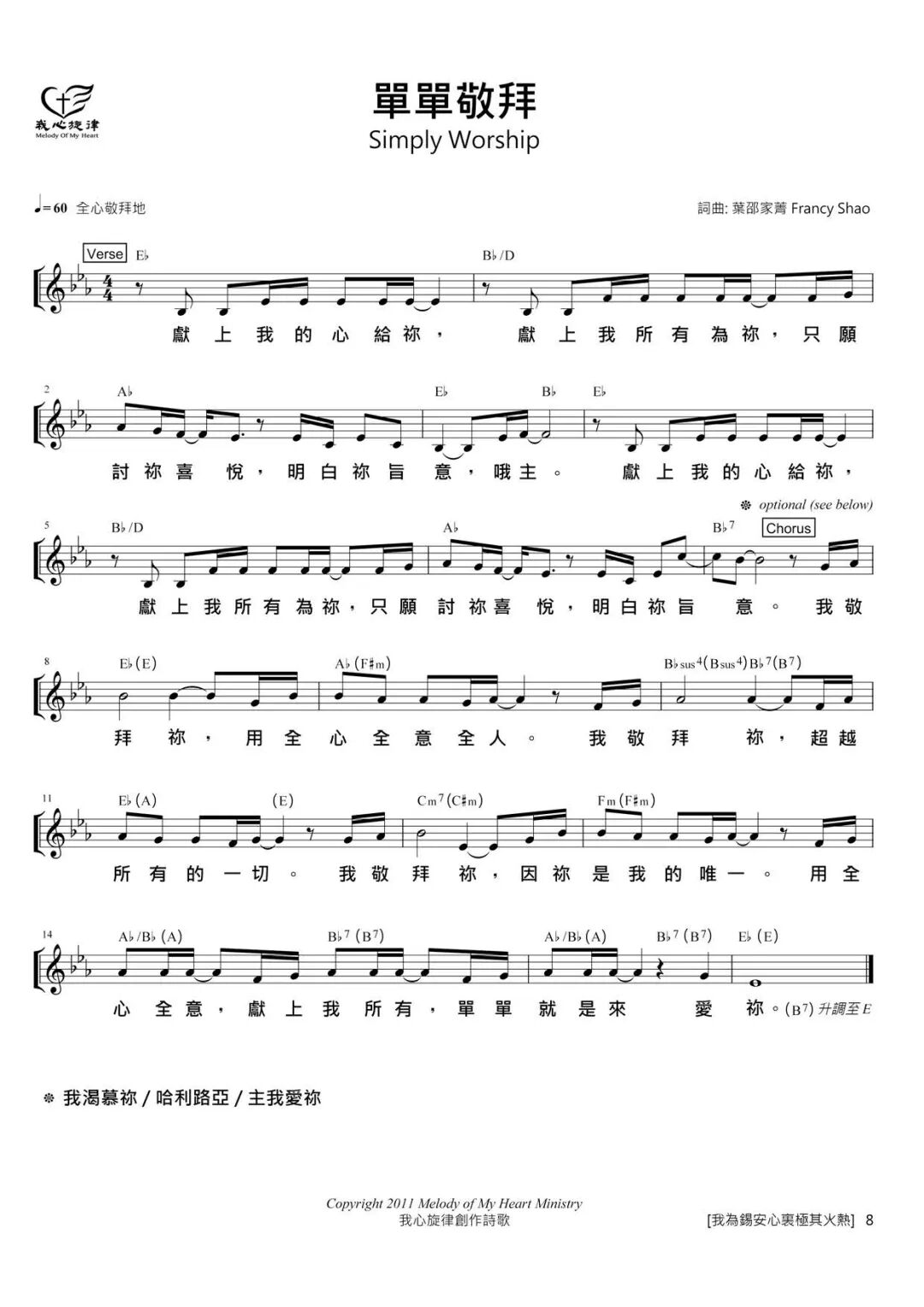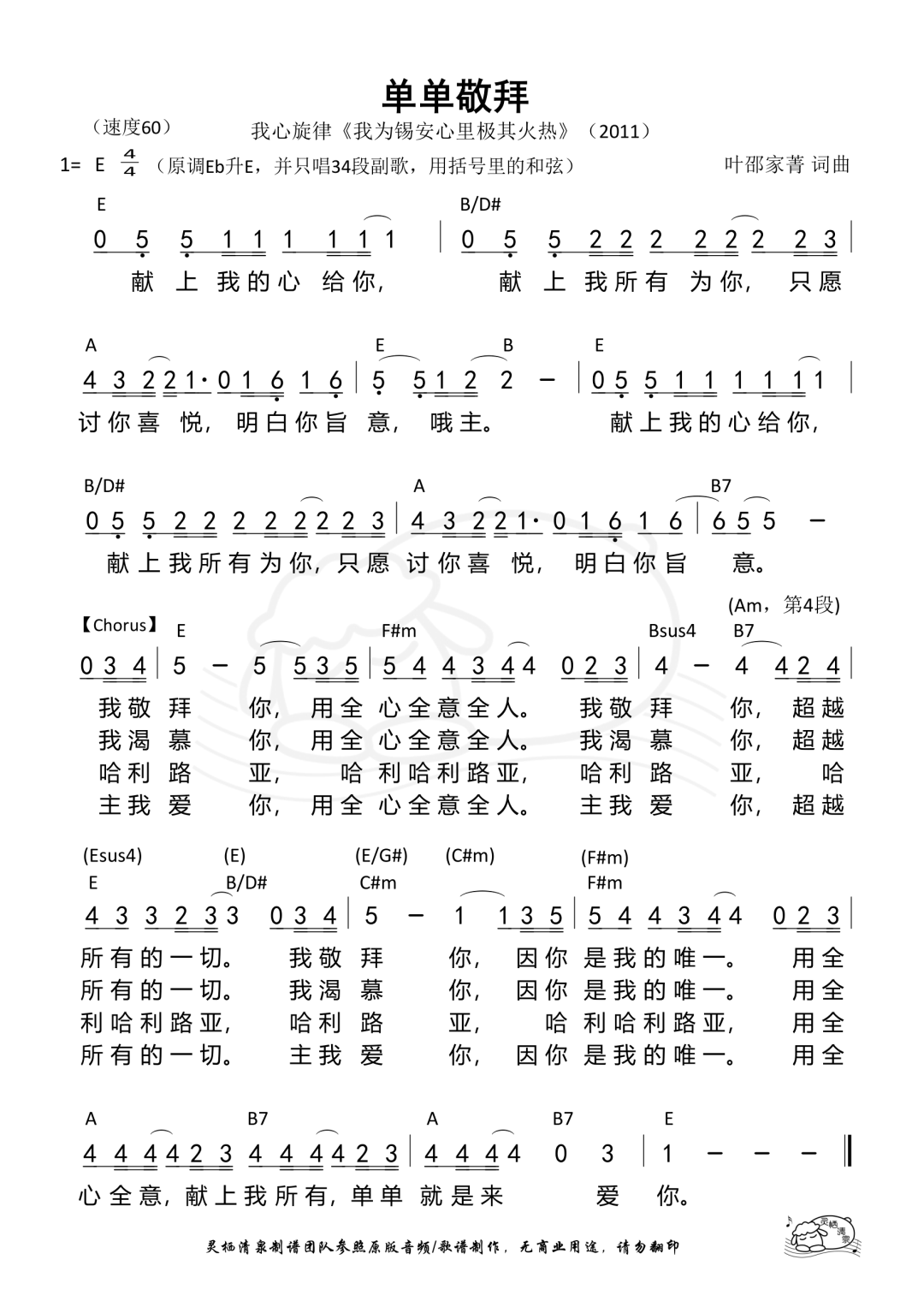 单单敬拜 作词:叶邵家菁 作曲:叶邵家菁 演唱:我心旋律 专辑:我为锡安心裡极其火热 - 我心旋律 献上我的心给你,献上我所有为你 只愿讨你喜悦,明白你旨意,哦主 献上我的心给你,献上我所有为你 只愿讨你喜悦,明白你旨意 我敬拜你,用全心全意全人 我敬拜你,超越所有的一切 我敬拜你,因你是我的唯一 用全心全意,献上我所有 单单就是来爱你 献上我的心给你,献上我所有为你 只愿讨你喜悦,明白你旨意,哦主 献上我的心给你,献上我所有为你 只愿讨你喜悦,明白你旨意 我敬拜你,用全心全意全人 我敬拜你,超越所有的一切 我敬拜你,因你是我的唯一 用全心全意,献上我所有 单单就是来爱你 我敬拜你...我的主...哦耶稣...我敬拜你 我渴慕你,用全心全意全人 我渴慕你,超越所有的一切 我渴慕你,因你是我的唯一 用全心全意,献上我所有 单单就是来爱你 哈利路亚,哈利哈利路亚 哈利路亚,哈利哈利路亚 哈利路亚,哈利哈利路亚 用全心全意,献上我所有 单单就是来爱你 主我爱你,用全心全意全人 主我爱你,超越所有的一切 主我爱你,因你是我的唯一 用全心全意,献上我所有 单单就是来爱你