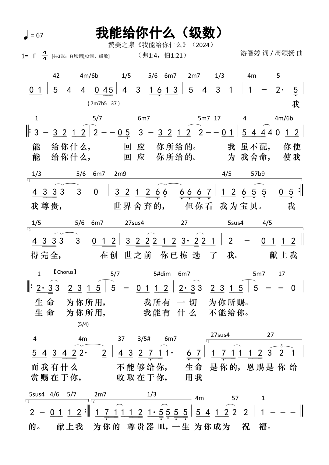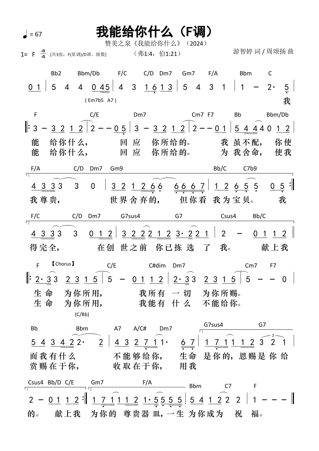 我能给你什麽 What Could I Bring To You 词:游智婷 Sandy Yu 曲:周颂扬 Samuel Chou © 2024 Stream of Praise Music / BMI. CCLI #7238658 [Verse] 我能给你什麽 回应你所给的 我虽不配 你使我尊贵 世界捨弃的 但你看我为宝贝 我能给你什麽 回应你所给的 为我捨命 使我得完全 在创世之前 你已拣选了我 [Chorus] 献上我生命 为你所用 我所有一切为你所赐 而我有什麽 不能够给你 生命是你的 恩赐是你给的 献上我生命 为你所用 我能有什麽不能给你 赏赐在于你 收取在于你 用我为你的尊贵器皿 一生为你成为祝福