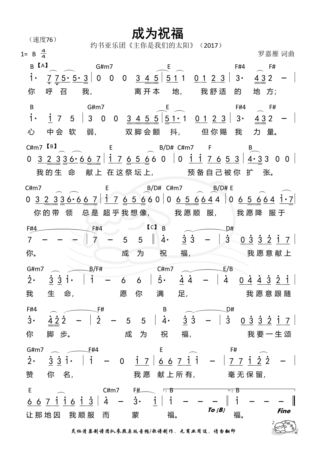 +- 首页 约书亚敬拜 正文 音频播放地址: 视频播放地址: 成为祝福 / Become a Blessing 词曲 罗嘉雁 演唱 李安钧 你呼召我 离开本地 我舒适的地方 心中会软弱 双脚会颤抖 但你赐我力量 我的生命 献上在这祭坛上 预备自己 被你扩张 你的带领 总是超乎我想像 我愿顺服 我愿降服于你 成为祝福 我愿意献上我生命 愿你满足 我愿意跟随你脚步 成为祝福 我要一生颂赞你名 我愿献上所有 毫无保留 让那地因我顺服而得福 歌谱: HTBB敬拜跨越 KUA MUSIC约书亚敬拜火把音乐天堂敬拜GoodTv环球敬拜 收藏 分享 链接