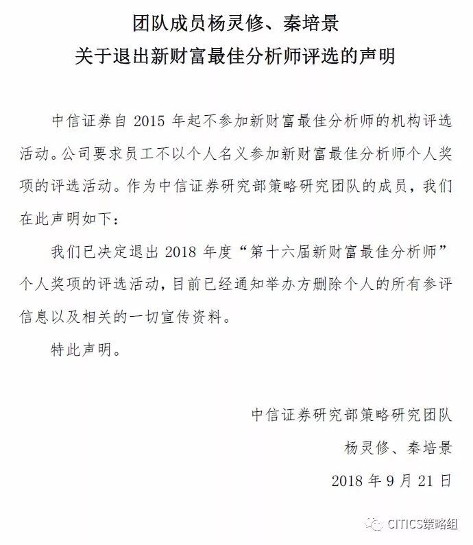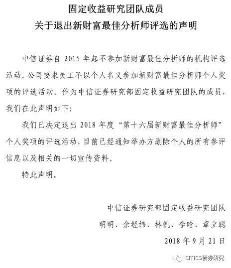随后,中信证券固定收益研究团队成员、策略团队成员先后发布关于退出新财富最佳分析师个人奖项评选的声明: