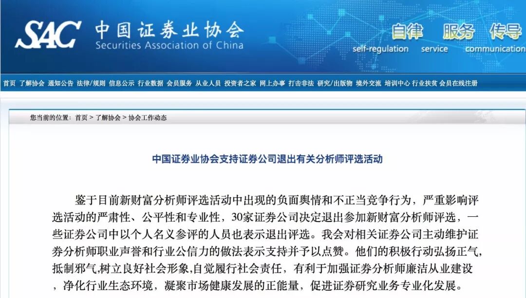 “鉴于目前新财富分析师评选活动中出现的负面舆情和不正当竞争行为,严重影响评选活动的严肃性、公平性和专业性,30家证券公司决定退出参加新财富分析师评选,一些证券公司中以个人名义参评的人员也表示退出评选。我会对相关证券公司主动维护证券分析师职业声誉和行业公信力的做法表示支持并予以点赞。他们的积极行动弘扬正气,抵制邪气,树立良好社会形象,自觉履行社会责任,有利于加强证券分析师廉洁从业建设,净化行业生态环境,凝聚市场健康发展的正能量,促进证券研究业务专业化发展。”