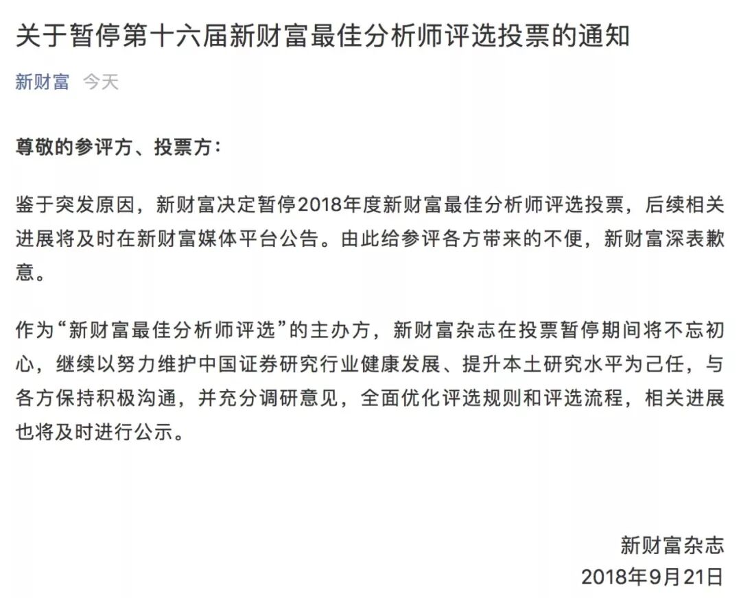 “鉴于突发原因,新财富决定暂停2018年度新财富最佳分析师评选投票,后续相关进展将及时在新财富媒体平台公告。由此给参评各方带来的不便,新财富深表歉意。