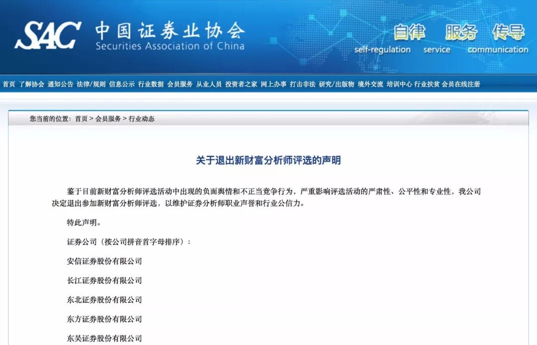 “鉴于目前新财富分析师评选活动中出现的负面舆情和不正当竞争行为,严重影响评选活动的严肃性、公平性和专业性,我公司决定退出参加新财富分析师评选,以维护证券分析师职业声誉和行业公信力。”
