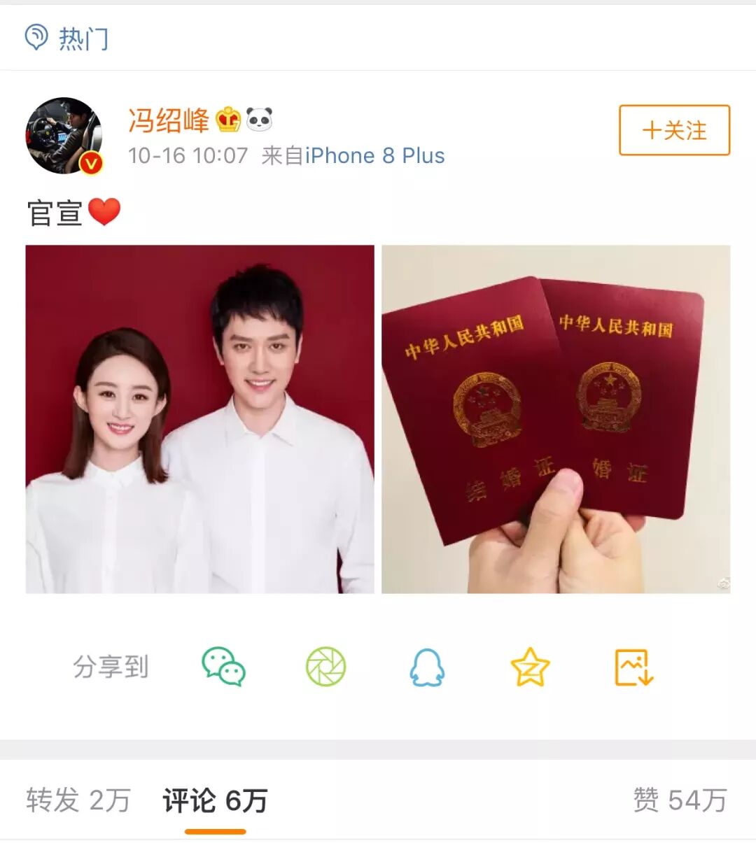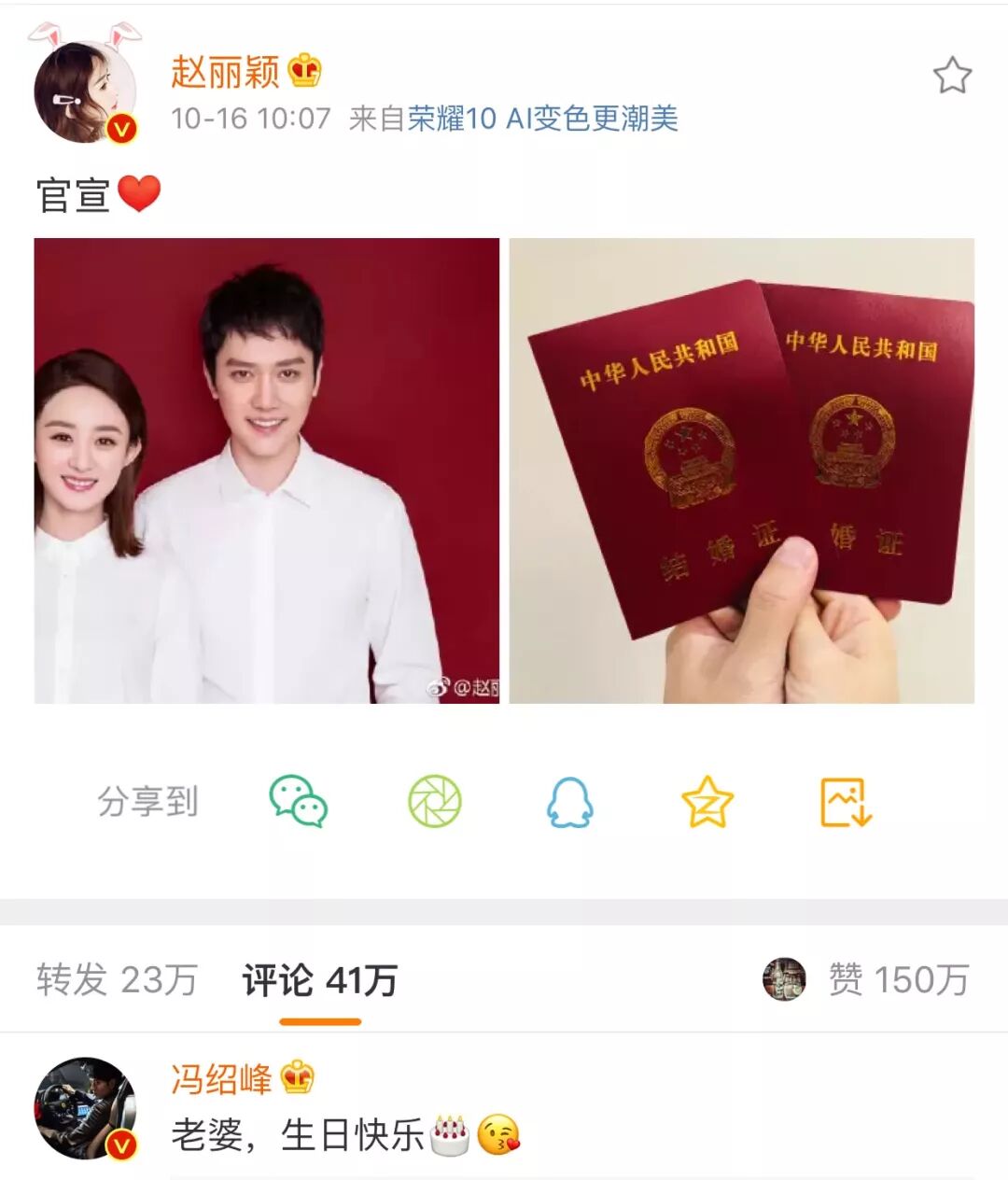 赵丽颖和冯绍峰在10月16日早上10点7分同时晒出结婚证,并配文“官宣”,紧接着冯绍峰又在赵丽颖的微博下评论了“生日快乐,老婆”。