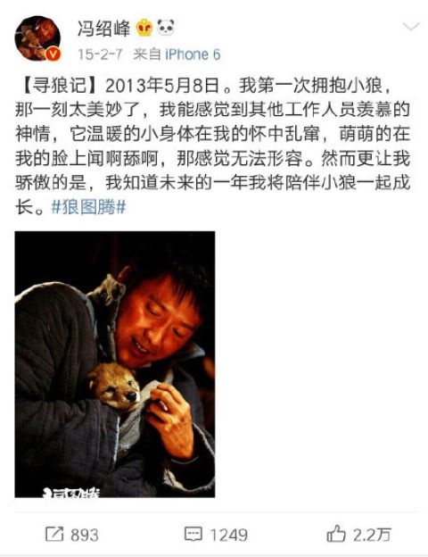 这张图片是冯绍峰拍摄电影《狼图腾》的花絮照,图中他爱意满满地抱着小狼崽,说是“充满父爱”也不为过。