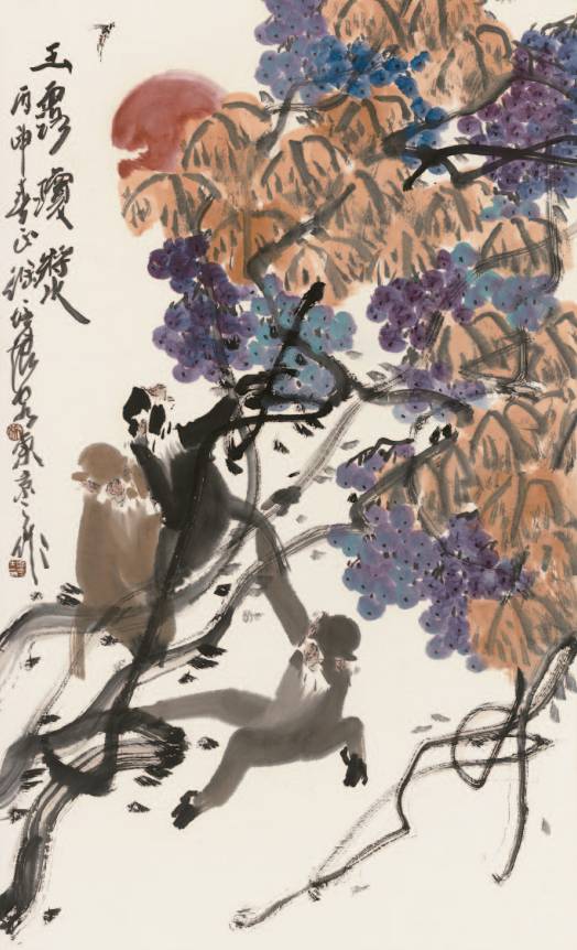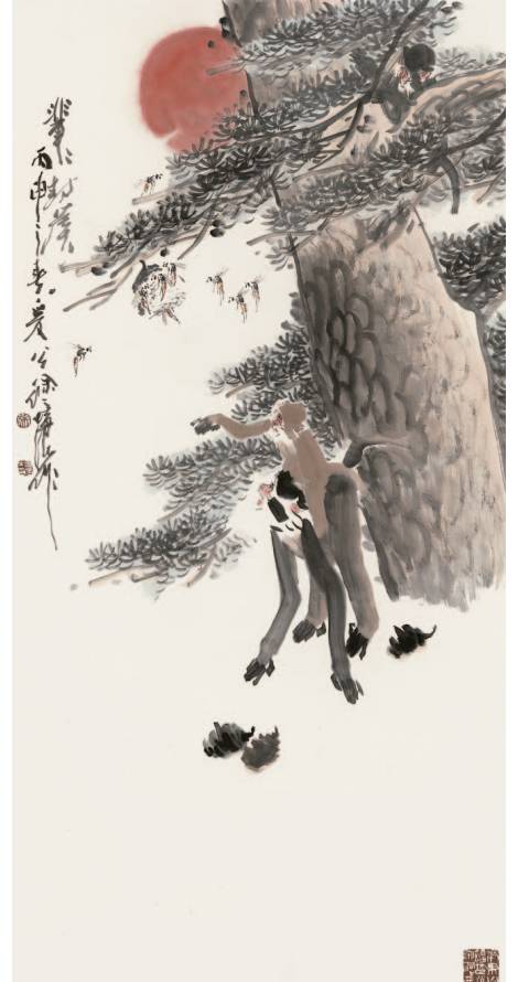其次,体现在情感的意趣上。中国画讲究借物寄情、借物传情、借物抒情,花鸟画的立意更是关乎人的感情。它不是为了描花绘鸟而描花绘鸟,不是照抄自然,而是紧紧抓住动植物与人们生活遭际、思想情感的某种联系而给以强化的表现。它既重视真,要求花鸟画具有“识夫鸟兽木之名”的认识作用,又非常注意美与善的观念的表达,强调其“夺造化而移精神遐想”的怡情作用,主张通过花鸟画的创作与欣赏影响人的志趣、情操与精神生活,表达作者的内在思想与追求。徐培晨在他的作品中,巧妙地把情感的表达融入其中。中国民间的传统中,猴是喜庆和吉祥的化身,又是显贵、驱邪纳福的象征,这些美好的寓意体现在徐培晨的画面之中,如《马上封侯》、《辈辈封侯》、《献寿图》等等。看到他的作品中的那些母子相依、山间嬉戏的猴子,让人忘记了它们是猴子,感受到令人动容的亲情、温情、母性和天性。程十发先生评价说:徐培晨画猿猴,聚于山石林泉之间,形态生动,令人如入山林之深处,画笔神奇,令人敬佩不止。