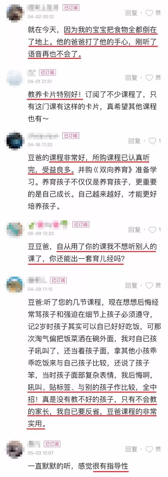豆爸的课程上线以来,有14000+妈妈订阅受益。很多妈妈觉得课程很有启发,听课时的自我反思让妈妈们意识到了自己育儿过程中其实存在很多问题:给孩子贴标签、吼叫孩子、打孩子、说孩子笨……