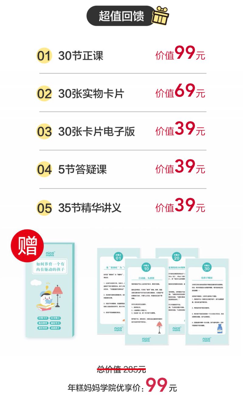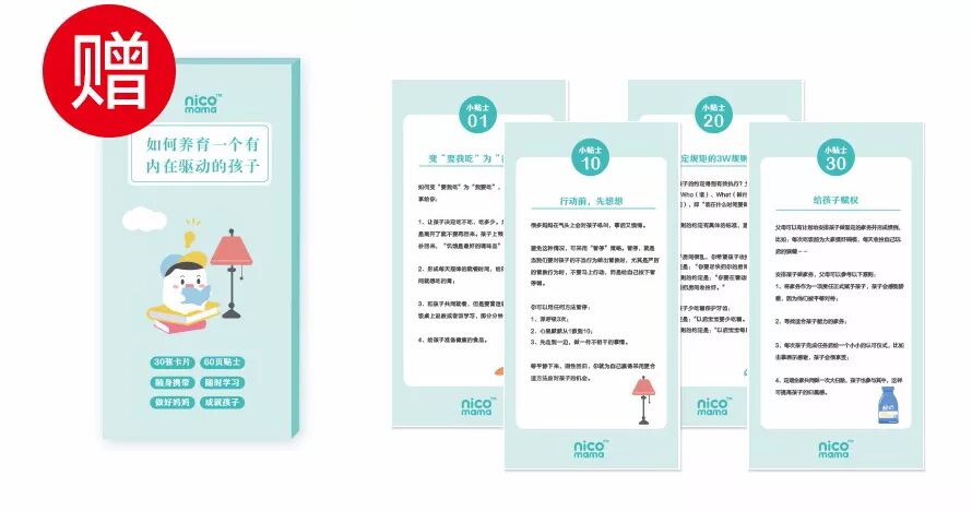 本次课程亲子学院特别赠送《如何养育一个有内在驱动力的孩子》系列卡片。30张卡片,60页贴士,实物免邮赠送!