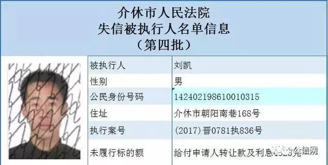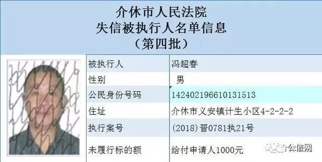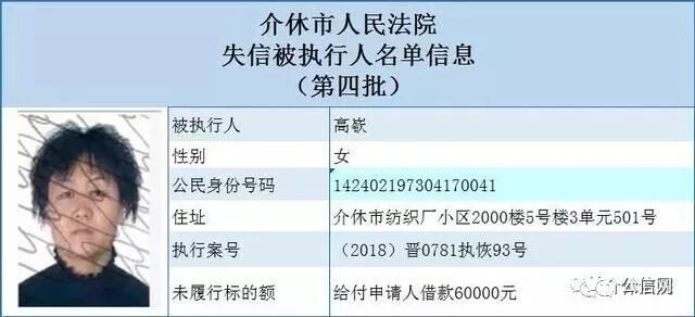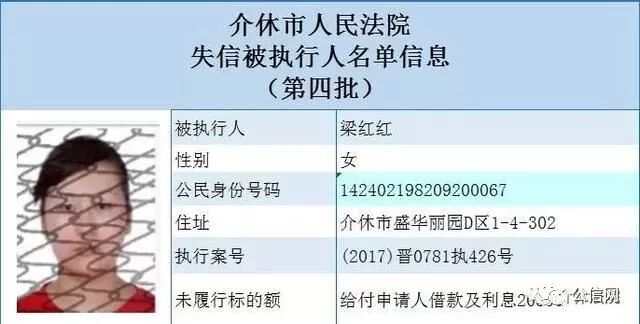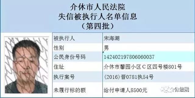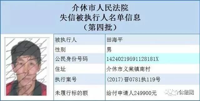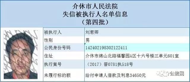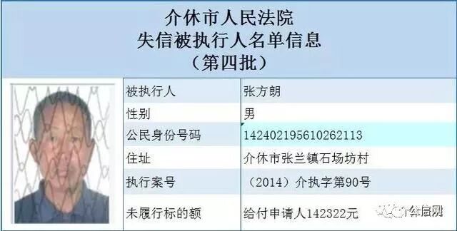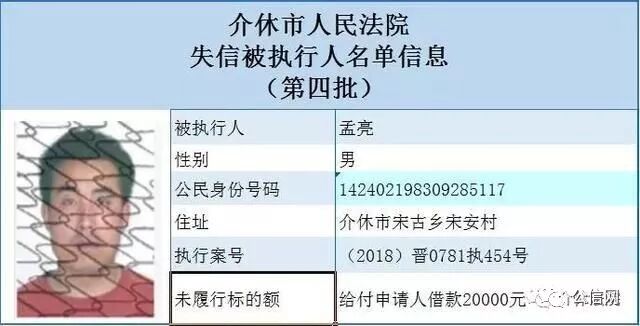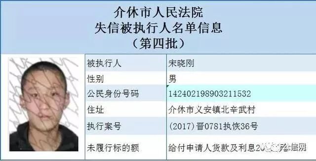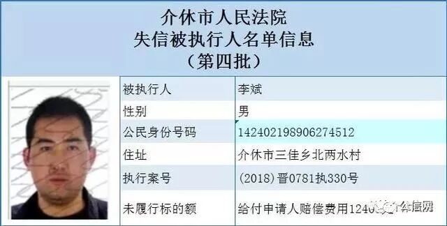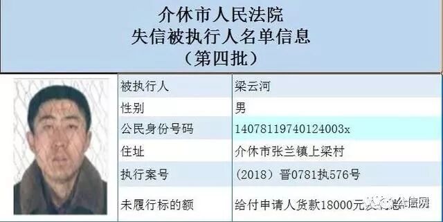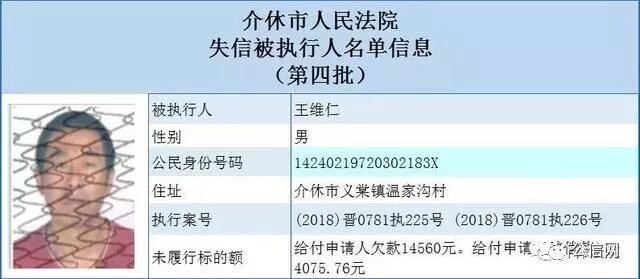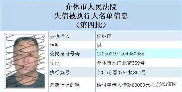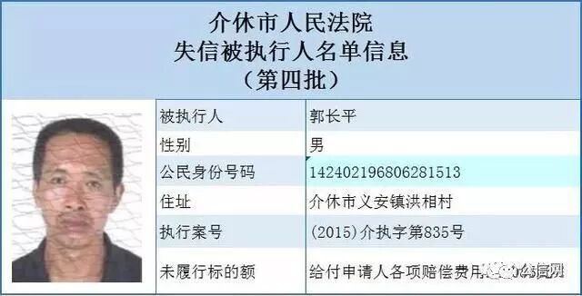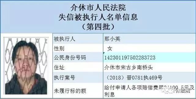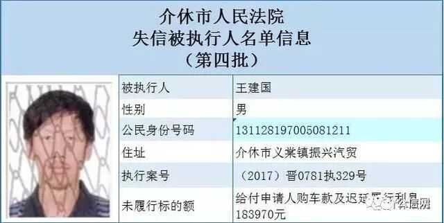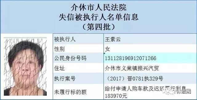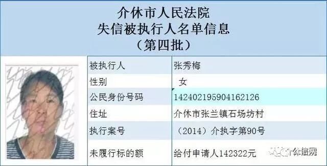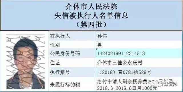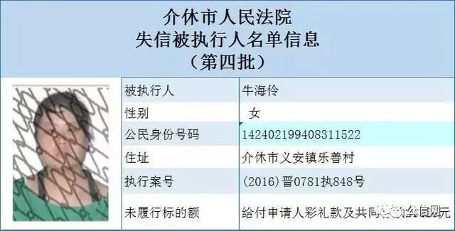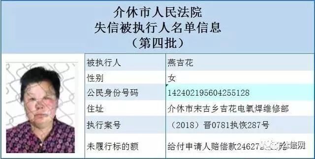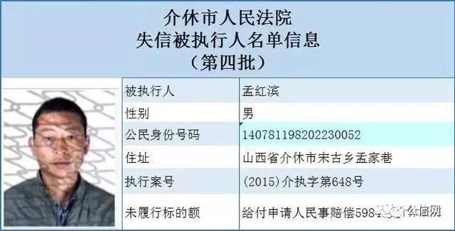 为了进一步制裁规避执行行为,推进社会诚信体系建设,依照《中华人民共和国民事诉讼法》、《最高人民法院关于公布失信被执行人名单信息的若干规定》的规定,介休市人民法院对第四批已进入执行程序,且尚未履行义务的被执行人予以曝光。