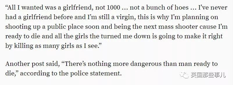 “我只想要一个女票,而不是1000个…不要那些婊子....我从来没有交过任何女朋友,我现在还是个处男,这,就是为什么我打算在公共场合发起大规模枪击行动,我已经准备好赴死了,那些所有曾拒绝过我的女人们也都去死吧,死越多越好。”